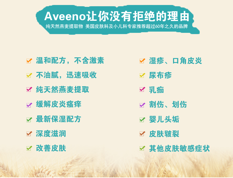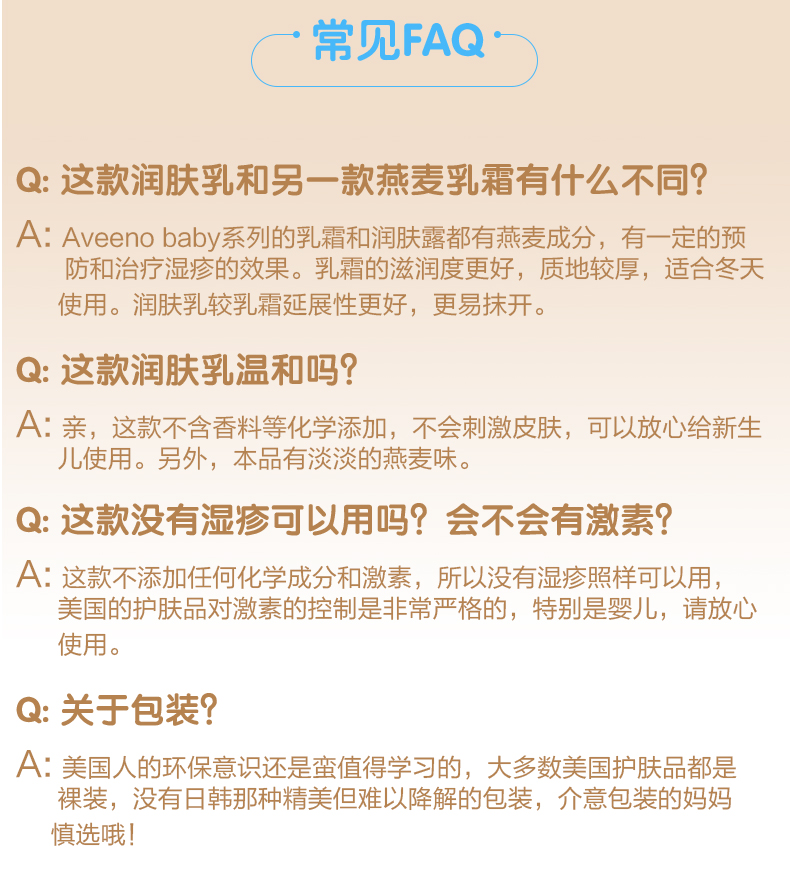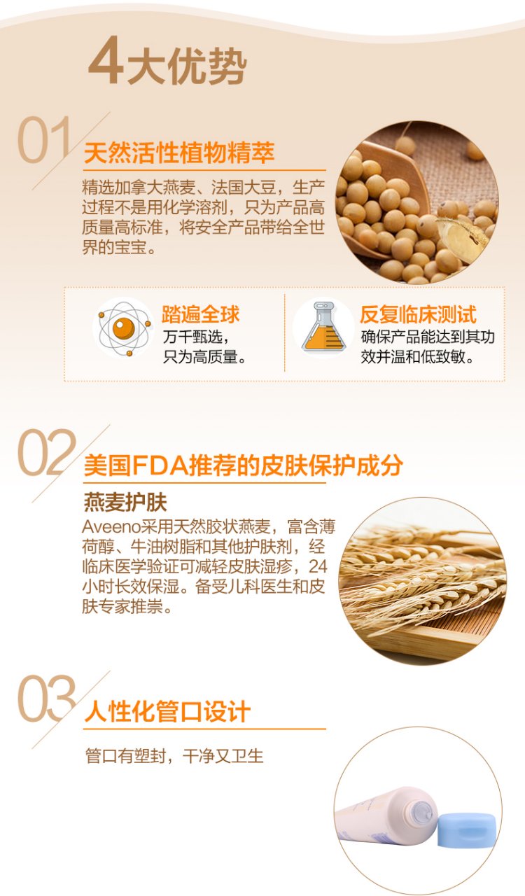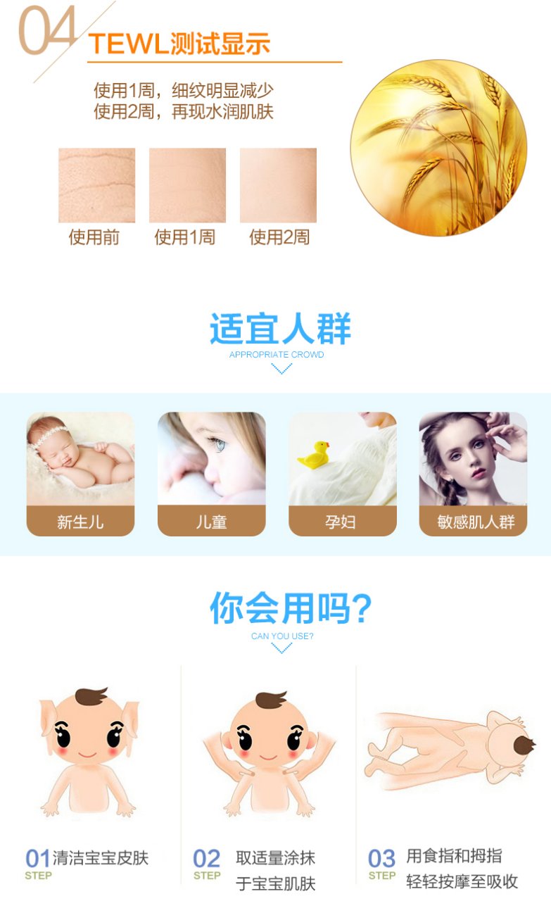 本品是一款高保湿的婴儿润肤露,蕴含丰富安抚肌肤的天然燕麦胶原精华,可以帮助补充皮肤水分,并且保湿的同时其天然成份有镇静及放松皮肤作用。经临床实验证明,本品能锁定水分长达24小时,针对于湿疹所造成的皮肤干燥,水分流失特别有效。临床证明这款乳霜可以减少因湿疹引起的皮肤干燥,干裂并能够给肌肤带来全天的保湿。