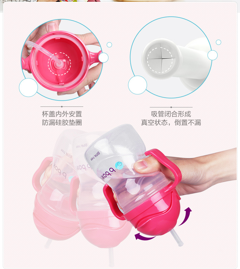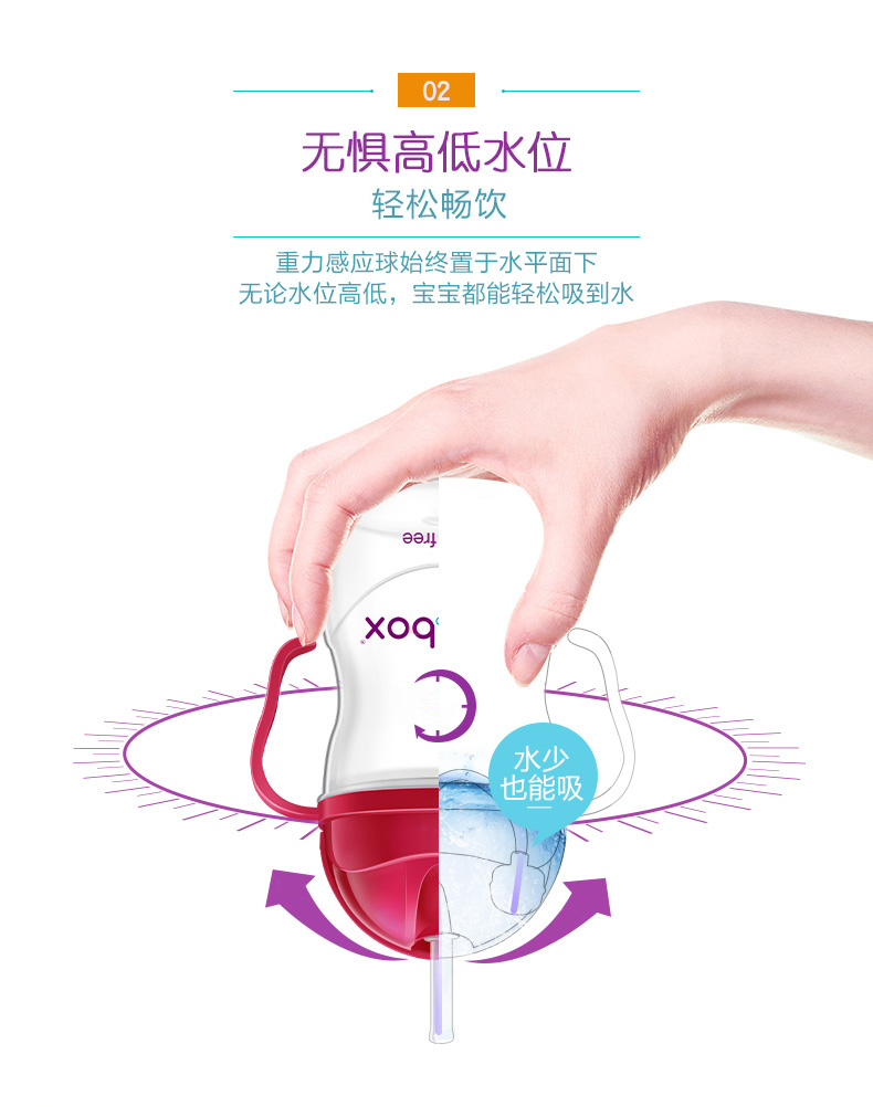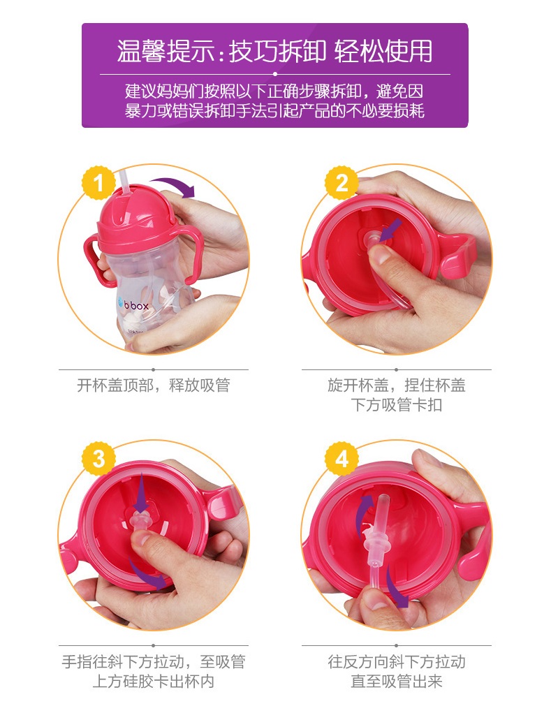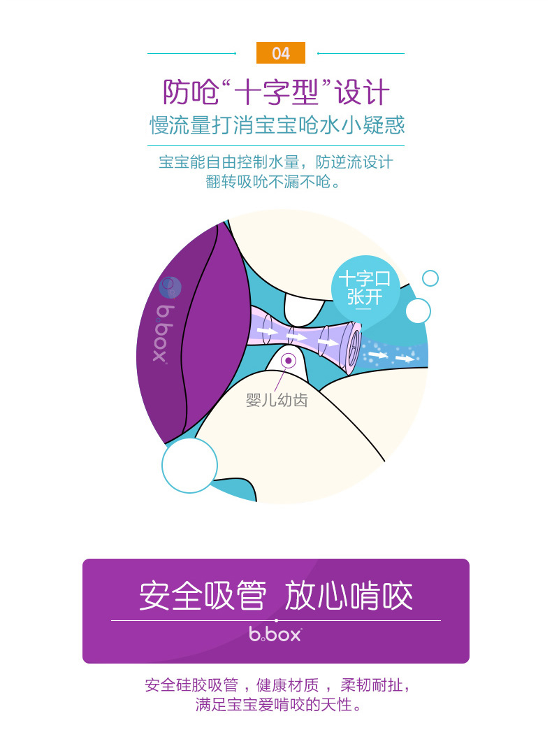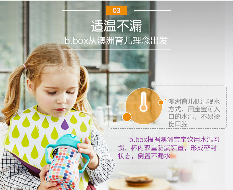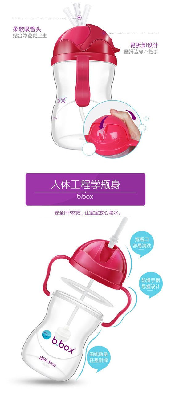 奶瓶以人体工学设计,弯角瓶身,令切合喂奶姿势需要。防胀气设计,能减少宝宝吸入空气而引致的腹绞痛及肠胃不适。瓶身防漏,耐用,瓶底更可扭开,轻松清洗透气软垫及瓶底盖,清洁彻底,让妈妈更安心。b.box 奶瓶设计,瓶底可以扭开,除了方便清洗外,更可以拧上b.box 独有的奶瓶储存盒,省冲奶时间。