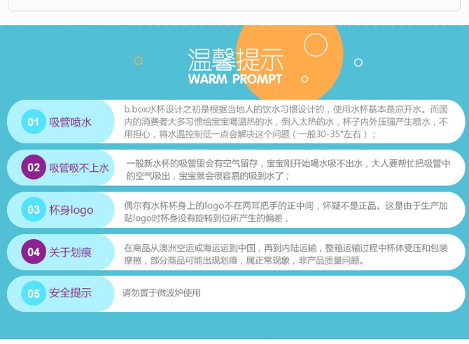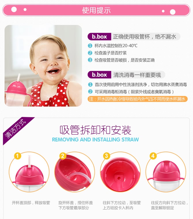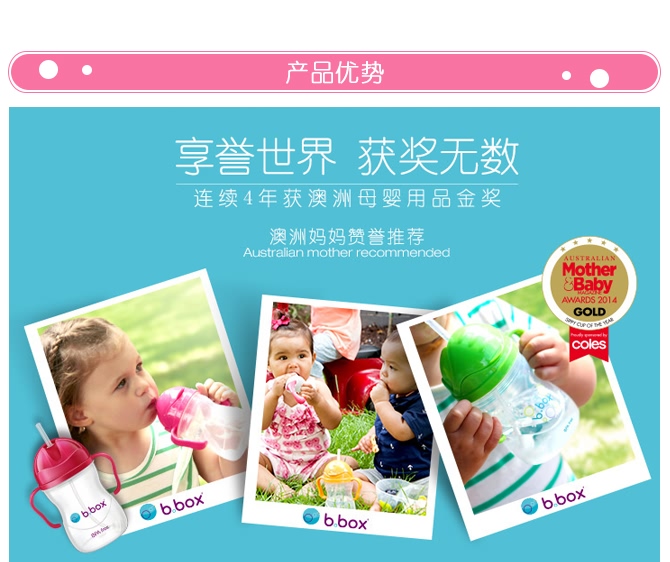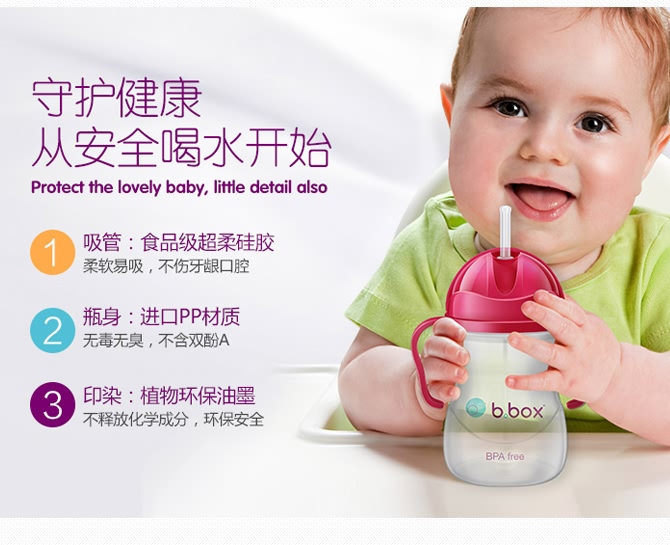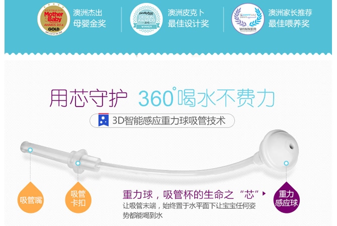 澳洲获奖无数的Bbox重力吸管杯超强防漏,360度无死角可以饮用,防漏设计 宝宝躺着喝也不会漏出来,360度无死角 无论以哪个角度喝水喝奶。重力球就会相应落在某个位置保证宝宝喝到每一滴水和奶。BPA, Phthalates and PVC free洗碗机可用,不要放进微波炉加热,不要倒入热饮,会烫伤宝宝 ,也是影响吸管使用寿命!