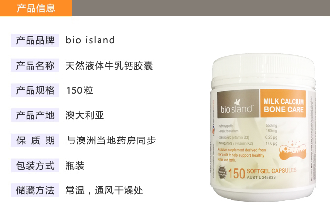 | 英文名称 | Bio Island Milk Calcium Bone Care 150 Softgel Capsules |