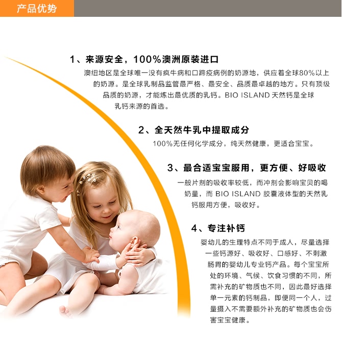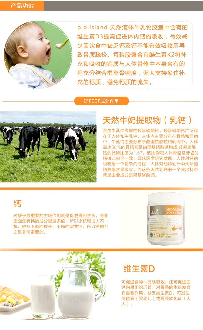 | 功效 | BIO ISLAND 天然牛乳钙骨保健胶囊中含有的维生素D3提高促进体内钙的吸收,有效减少因饮食中缺乏钙及钙不能有效吸收所导致骨质疏松。每粒胶囊含有维生素K2将补充和吸收的钙质与人体骨骼中本身含有的钙充分结合提高骨密度,强大支持锁住补充的钙质,避免钙质的流失。 |