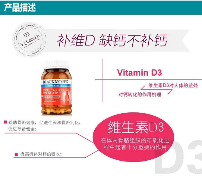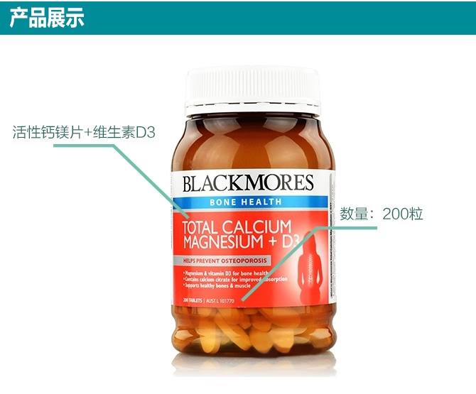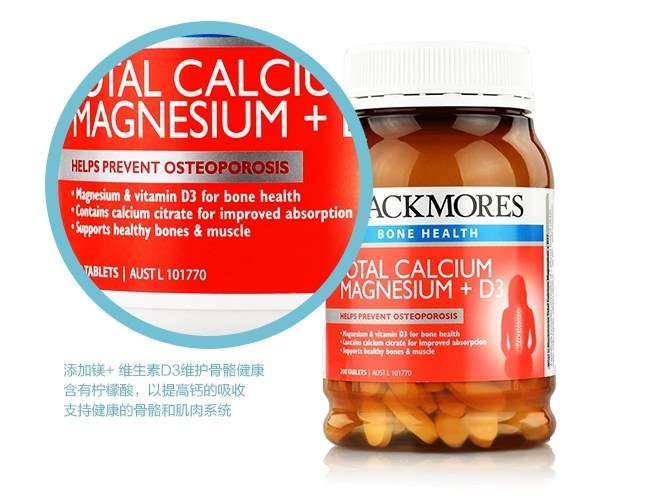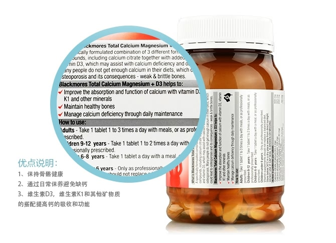 Blackmores 活性钙镁+维生素D3片含有的钙和镁的配方比例是2:1,是最理想的组合配方比率。含有维生素D3、维生素K1及矿物质以帮助人体更好的吸收钙质。钙是人体含量最多的矿物质,人体99%的钙都存在于骨骼中。钙的主要作用是重建与维持骨骼和牙齿。钙同时也作用于新陈代谢,比如神经传输,肌肉收缩以及调节心肌功能。钙和镁是骨骼健康的必要元素,同时在肌肉和神经功能重起着重要作用。本产品是符合需求比例的,按照钙和镁2:1维生素D是帮助钙吸收与运用的必要元素。维生素D不足,也会导致骨强度和骨密度下降,以及关节疼痛。