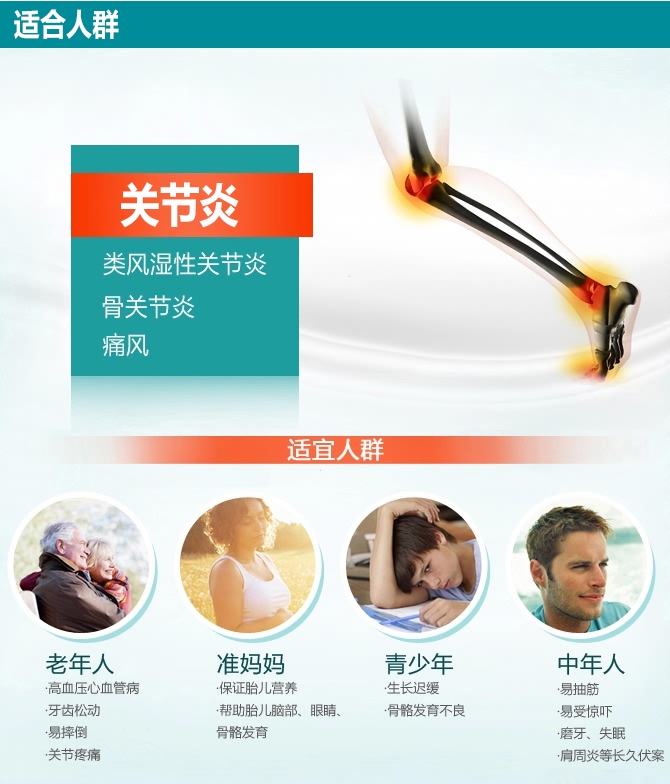 | 适用人群 | 1.关节红、肿、热痛、反复发作,发病典型部位为拇指、大脚趾关节(包括膝、腕、肘和掌指关节等部位)。 2.饮酒,伤口感染,创伤和手术诱发的痛风病症。 3.平时怕冷饮、容易疲劳、关节活动不灵活、行走不便。 4.家族中有痛风病史、血尿酸含量明显高于正常水平。 5.有原因不明的泌尿系统结石,尤其是多发性肾结石或双侧肾结石。 |