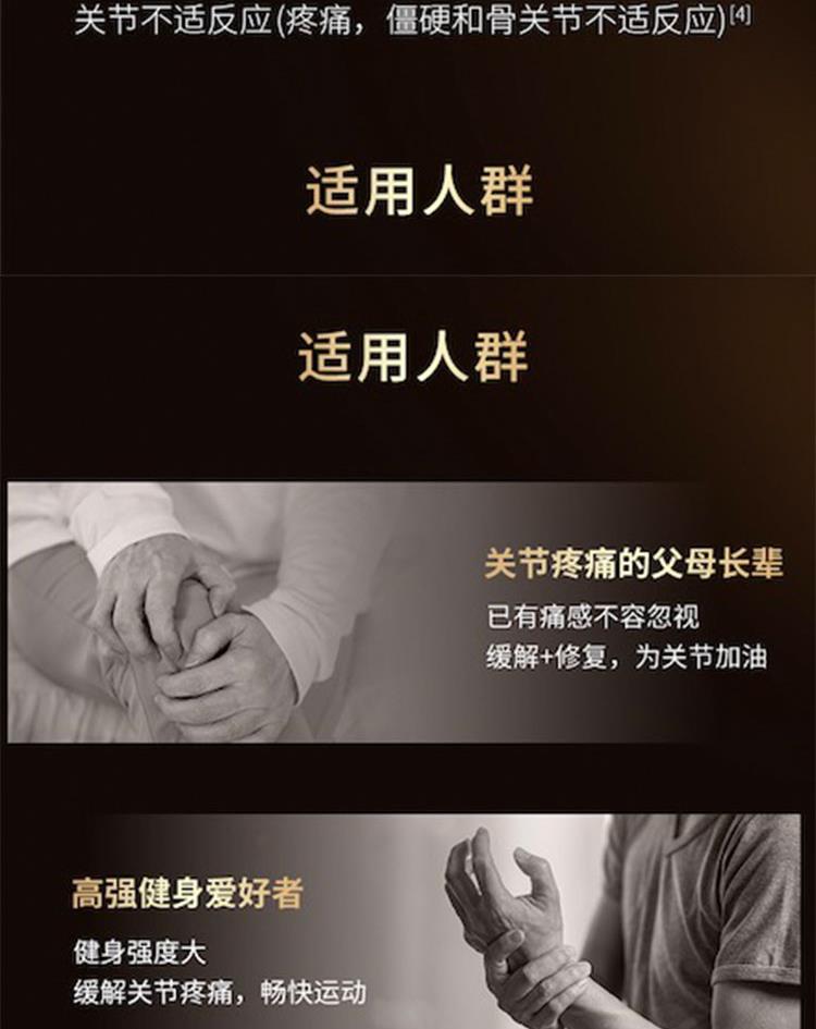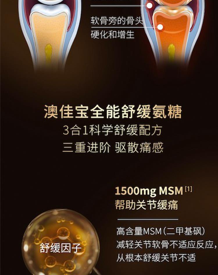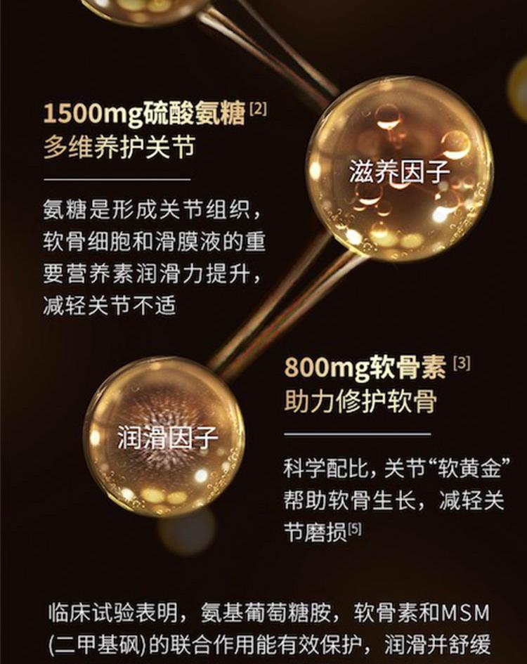 有效成分:牛硫酸软骨素钠 200 毫克,二甲基砜 375 毫克,硫酸葡萄糖胺氯化钠 471 毫克 等效:硫酸葡萄糖胺 375 毫克