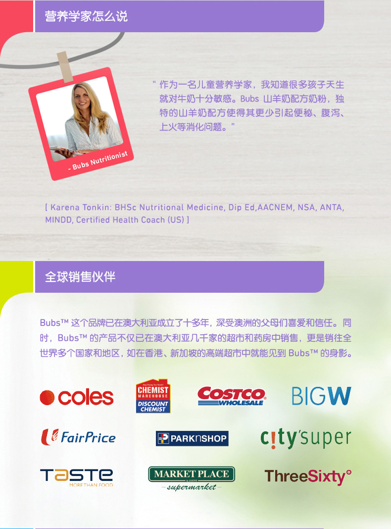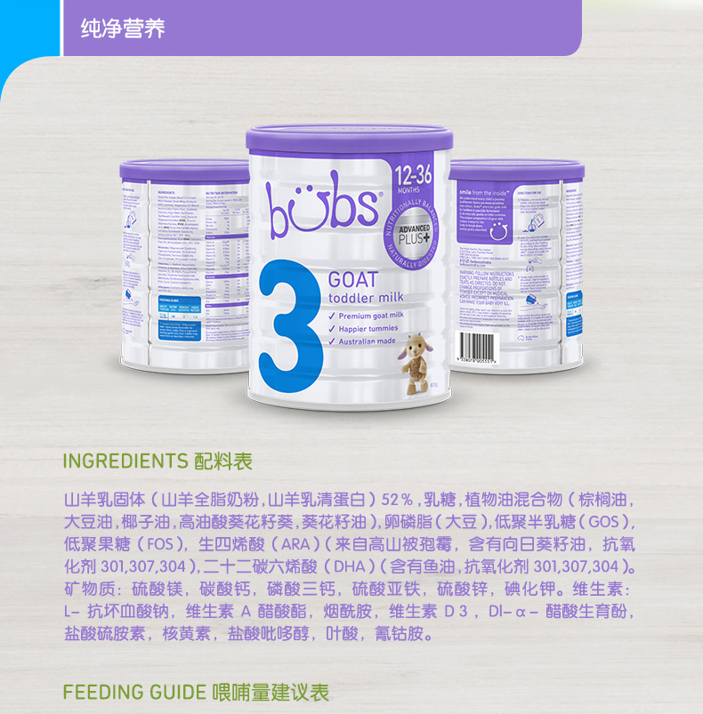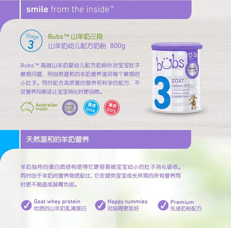 Bubs 贝儿 婴幼儿羊奶粉 3段专为12个月至36个月的宝宝量身设计,全面呵护宝宝健康成长。口感非常清淡,奶味更浓醇,无脂味。可用于混合喂养,内含宝宝智力与身体发育的关键因子,给宝宝全面的营养呵护,羊奶更容易被宝宝吸收。一杯成长奶粉含有25-50%每天所需吸收的16种矿物质及维生素,有助大脑、骨骼和牙齿发育。同时提供宝宝成长所需的钙质及蛋白质,促进宝宝的生长发育。
