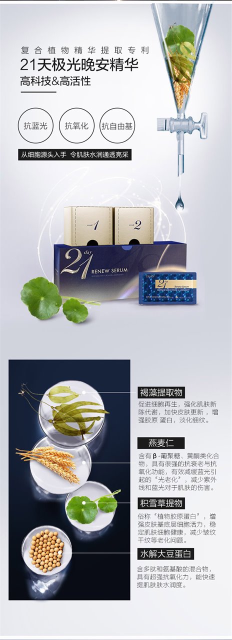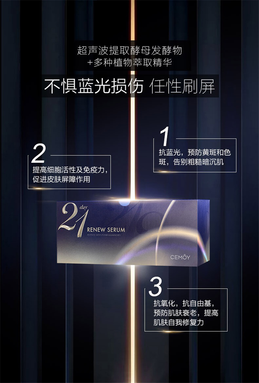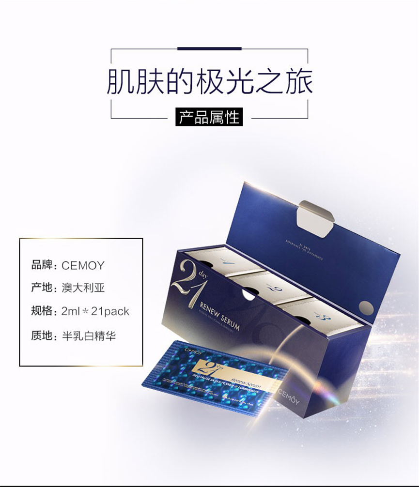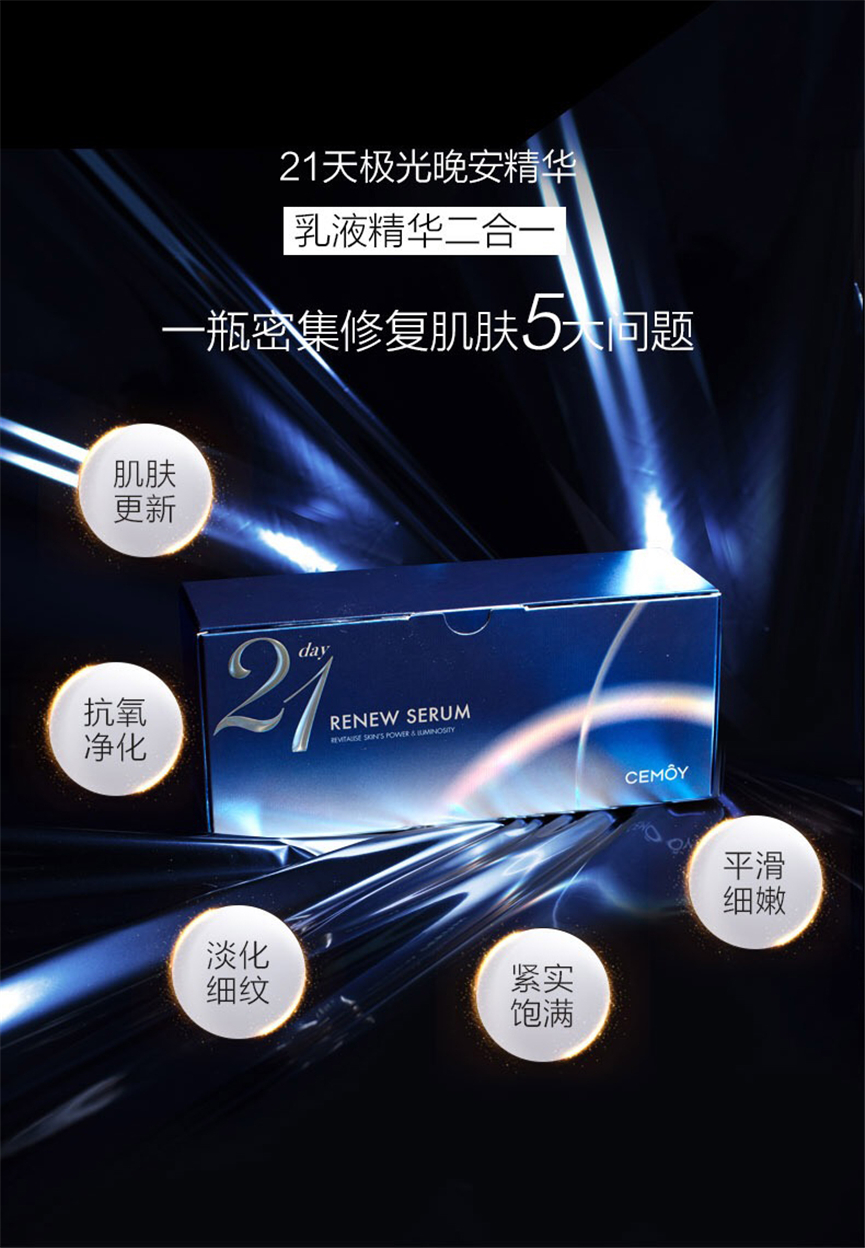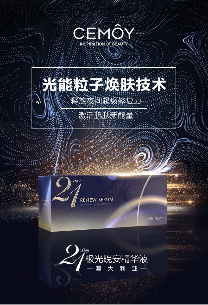 Cemoy 21天极光晚安精华液 2ml*21包 复合天然植物精萃,高效率高活性抗氧HUA,深入润泽焕亮,滋养肌底,刷新肌龄。抗蓝光,抗氧化,打造肌肤夜间修复力。