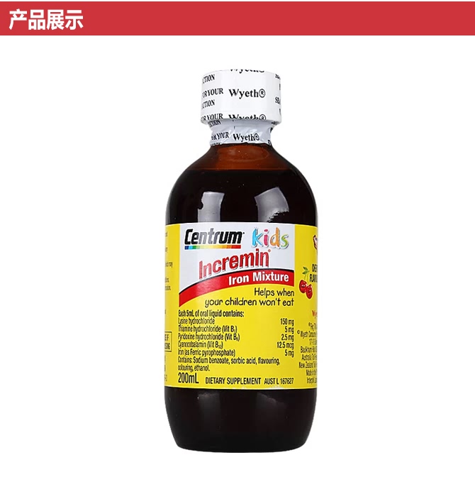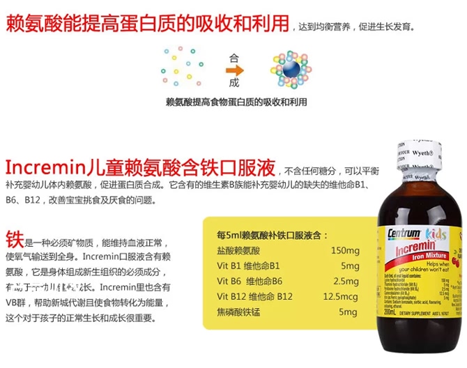 惠氏药厂Incremin儿童复合维生素含铁口服液(樱桃口味),不含任何糖分,可以平衡补充婴幼儿体内赖氨酸,促进蛋白质合成。它含有的维生素B族能补充婴儿缺失的维他命B1、B6、B12,改善宝宝挑食厌食问题。