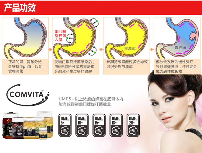 康维他活性麦卢卡蜂蜜UMF10+,15+,20+含有天然独麦素(UMF),它是由纽西兰怀卡托大学教授皮得.莫兰博士发现的一种特殊的无过氧化氢抗菌活性物质.目前未有在任何其它蜂蜜中发现UMF TM物质,致使UMF TM麦卢卡成为世界上最珍贵的蜂蜜之一。