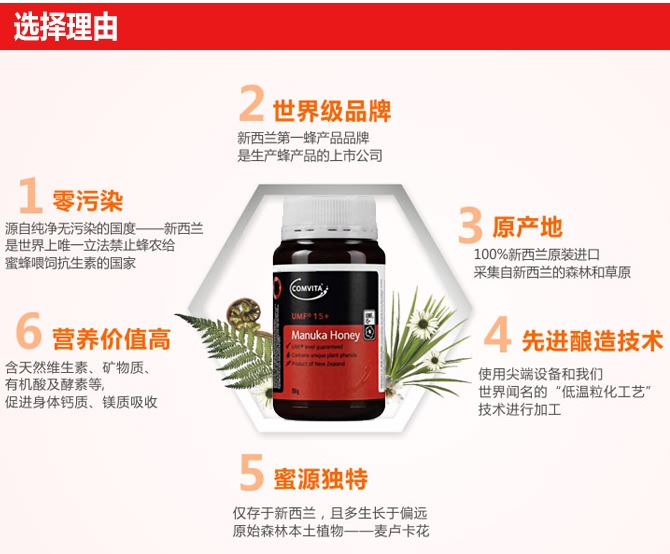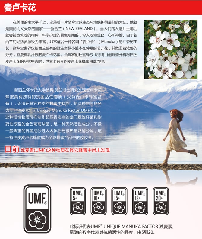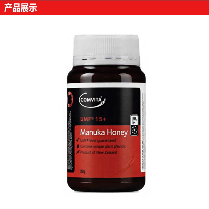 康维他活性麦卢卡蜂蜜UMF10+,15+,20+含有天然独麦素(UMF),它是由纽西兰怀卡托大学教授皮得.莫兰博士发现的一种特殊的无过氧化氢抗菌活性物质.目前未有在任何其它蜂蜜中发现UMF TM物质,致使UMF TM麦卢卡成为世界上最珍贵的蜂蜜之一。