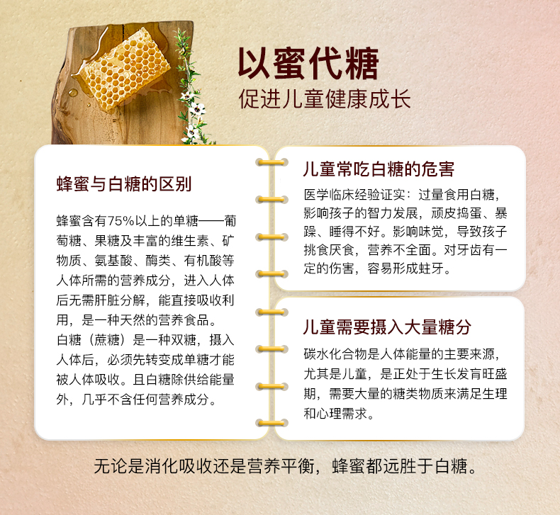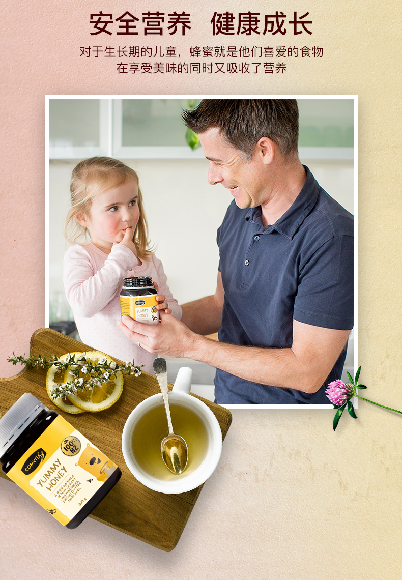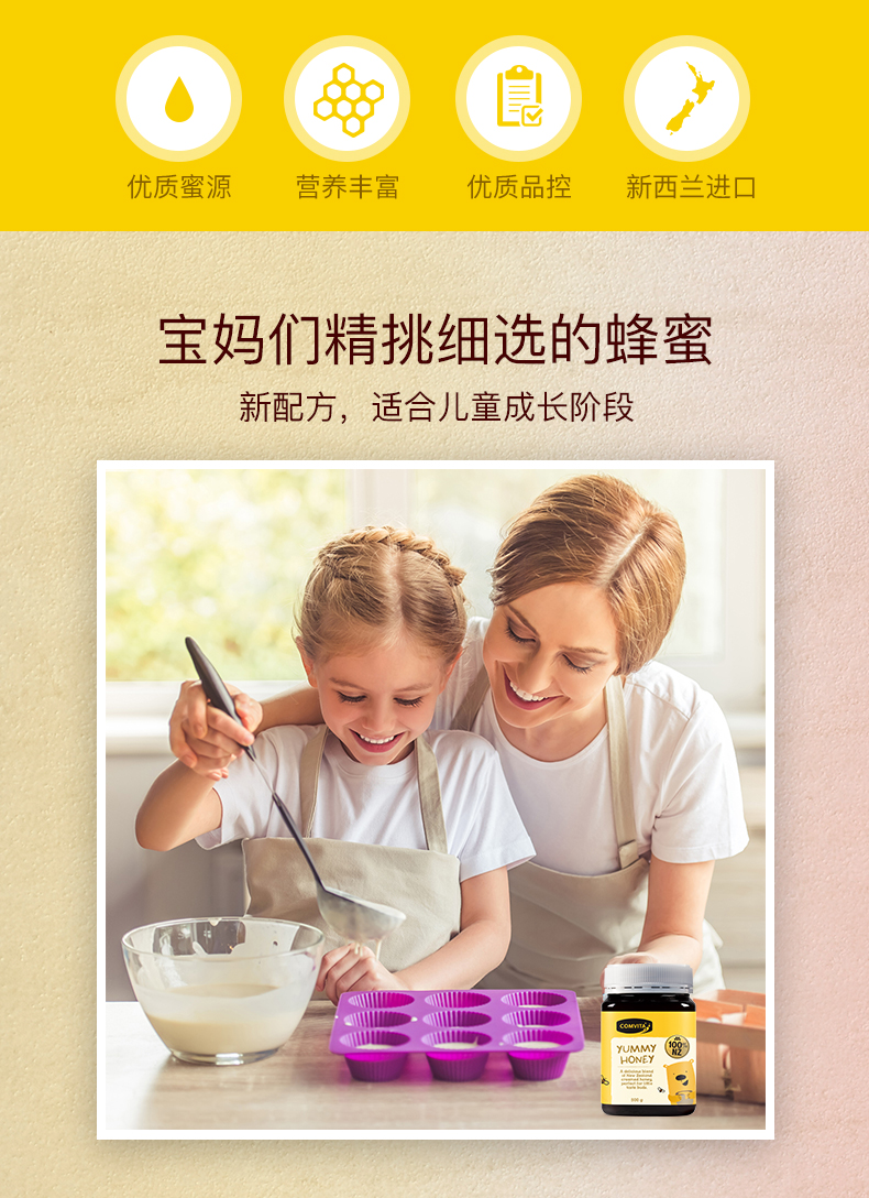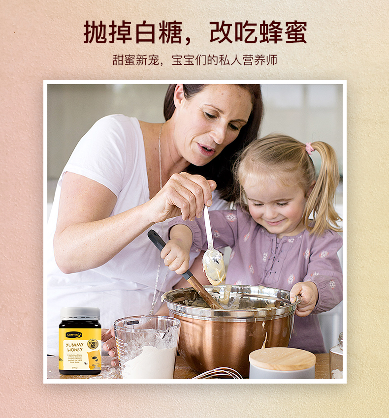 Comvita 康维他儿童蜂蜜是由三种美味的新西兰蜂蜜混合而成的。食用儿童蜂蜜,能够减少其他糖类的摄取,可以预防龋齿的发生。蜂蜜中含有特殊物质,可以预防牙菌斑的产生,因此可以有效预防龋齿。还具有新陈代谢、免疫、助长发育、增强记忆、健肠胃、促进血液循环等多种作用。