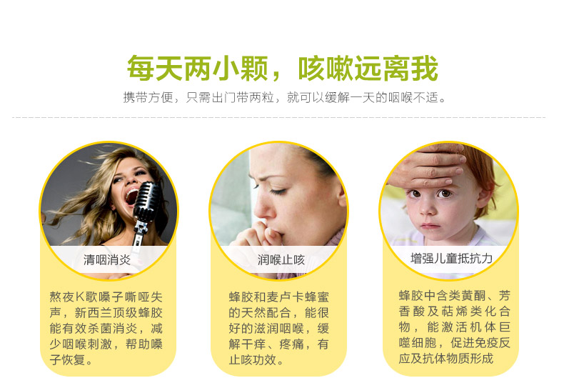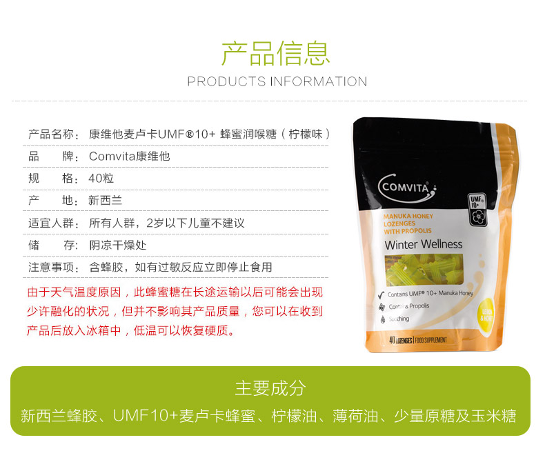 麦卢卡蜂蜜的温和甜味 滋润你的嗓子 -- 提高免疫、润喉止痰、消炎阵痛,三大功效一次满足。柠檬口味、活性UMF(独麦素)、10+麦卢卡蜂蜜的绝妙组合.缓解嗓子的不适症状,对杀死病毒、细菌以及真菌具有独特功效,是极受家庭欢迎的产品。