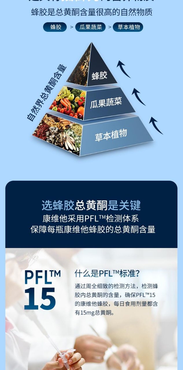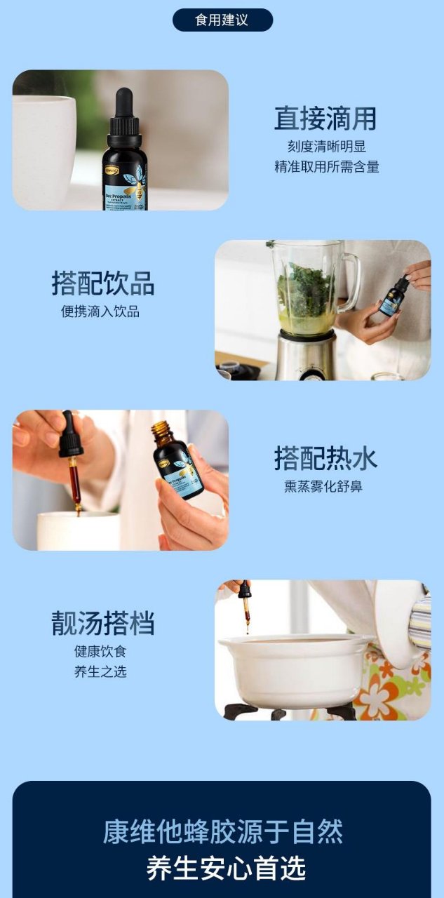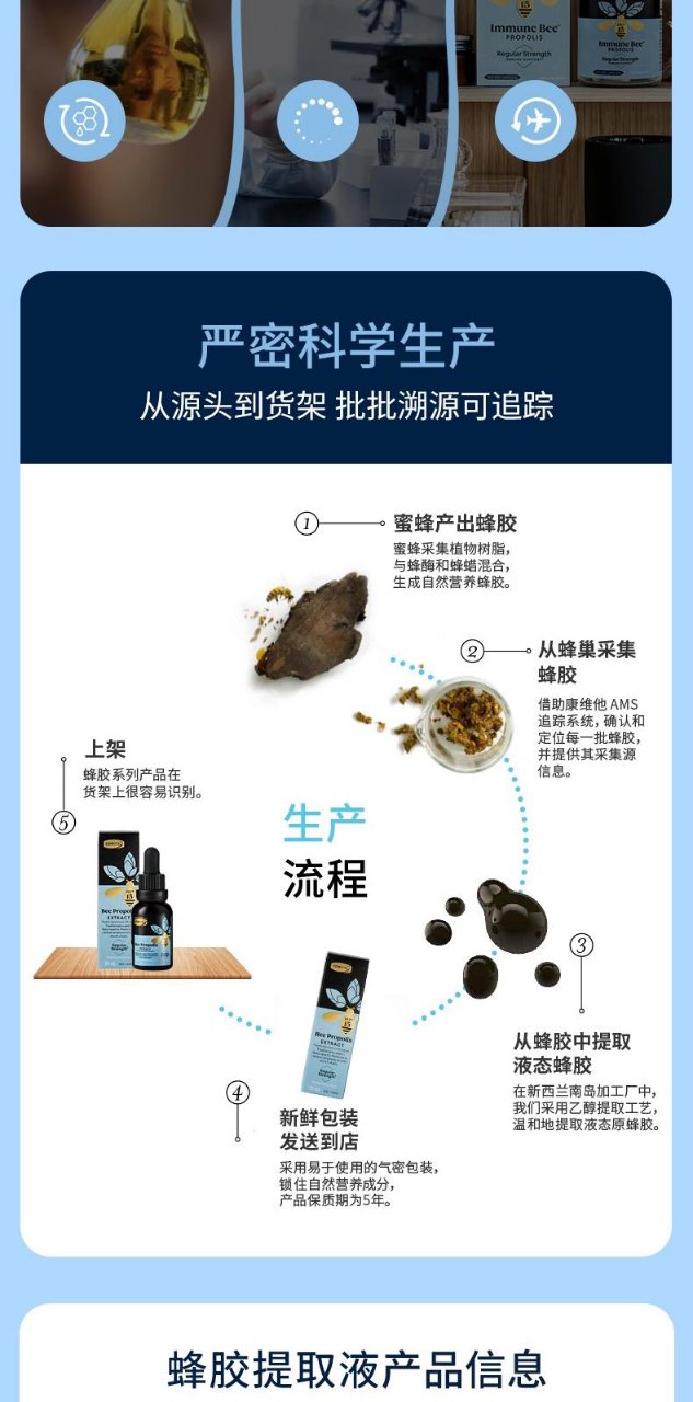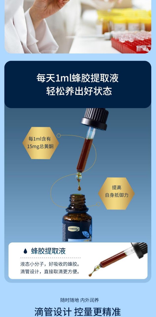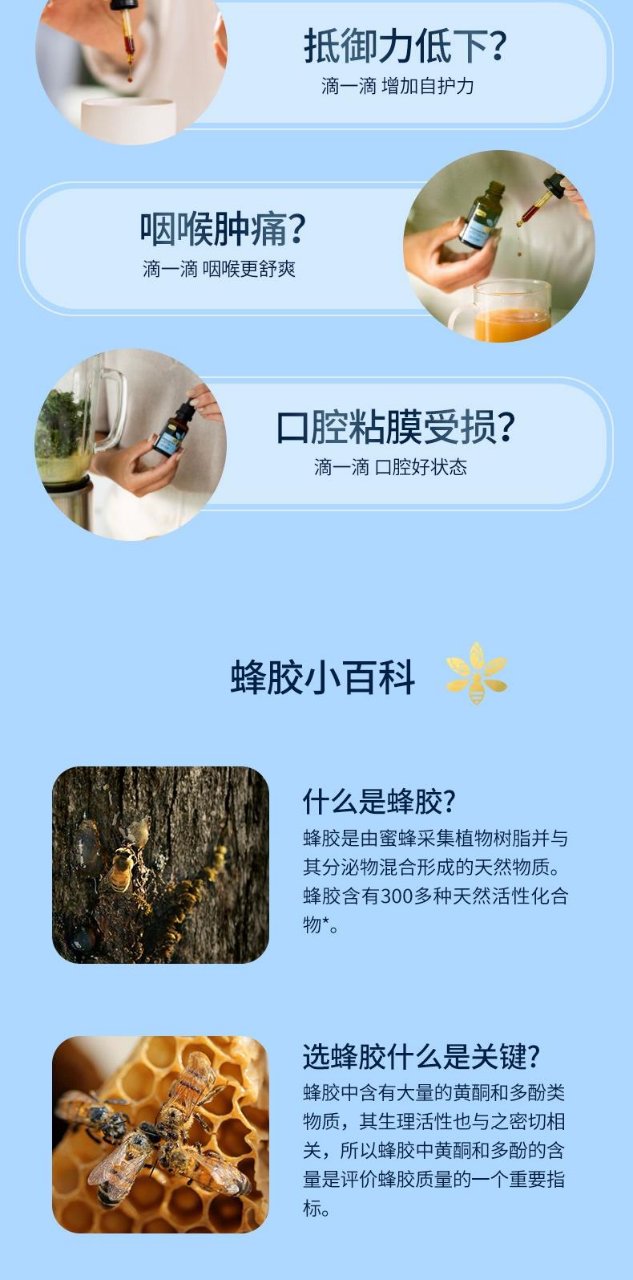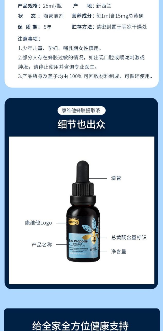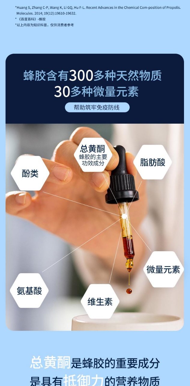 每1mL含:蜂胶萃取液106mg,相当于鲜蜂胶504mg,相当于黄酮15mg。含花粉。