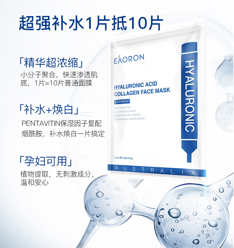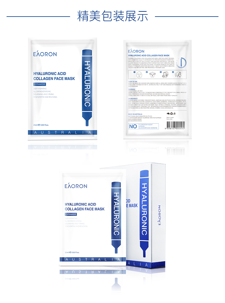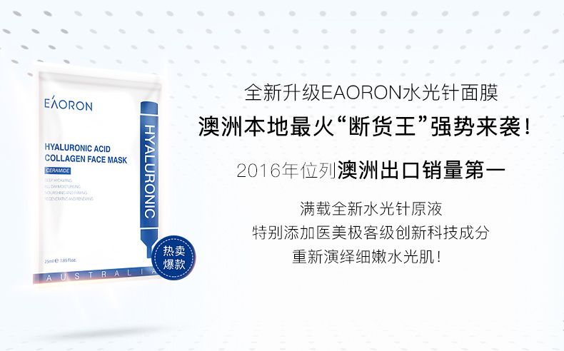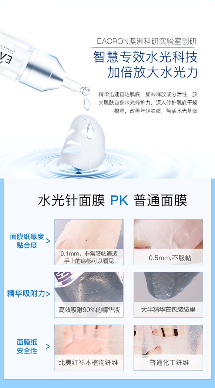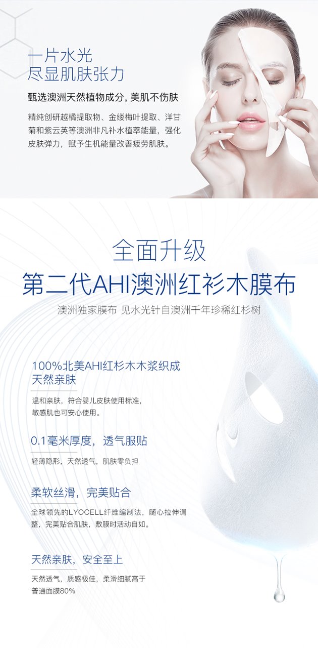 世界上最轻薄的、亲肤性最强的AHI红杉木面膜纤维被澳大利亚著名护肤品品牌EAORON独家买断发明专利,用来生产澳洲第一款水光针面膜!其轻、薄、透、服贴、纯天然、可降解的特点,将成为面膜的新技术标竿!