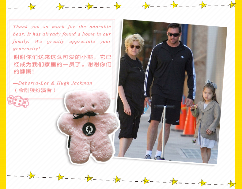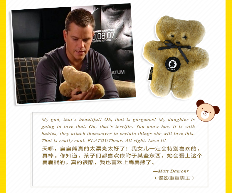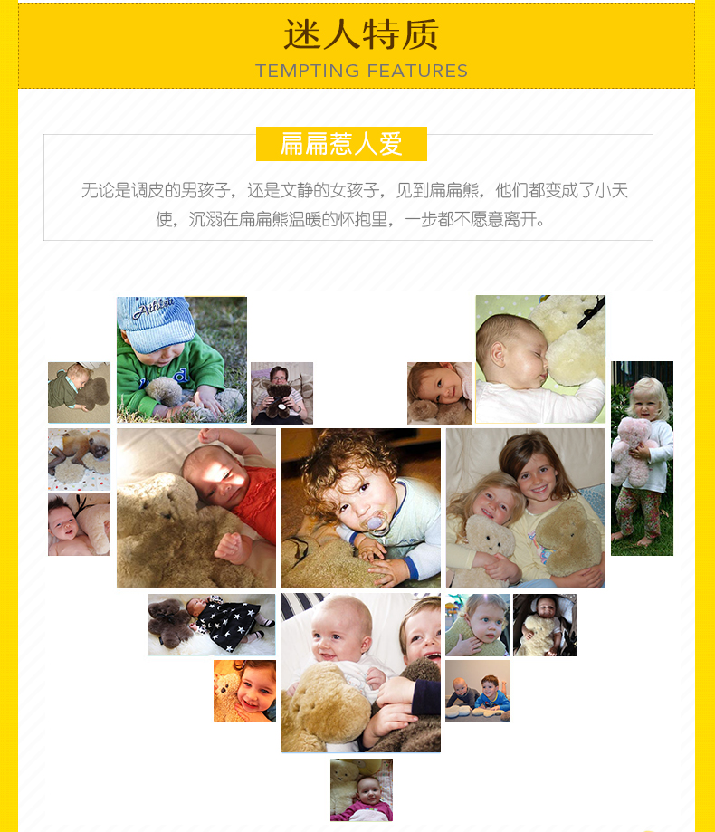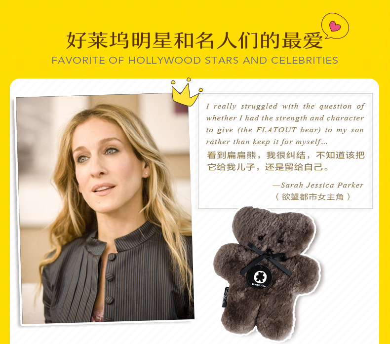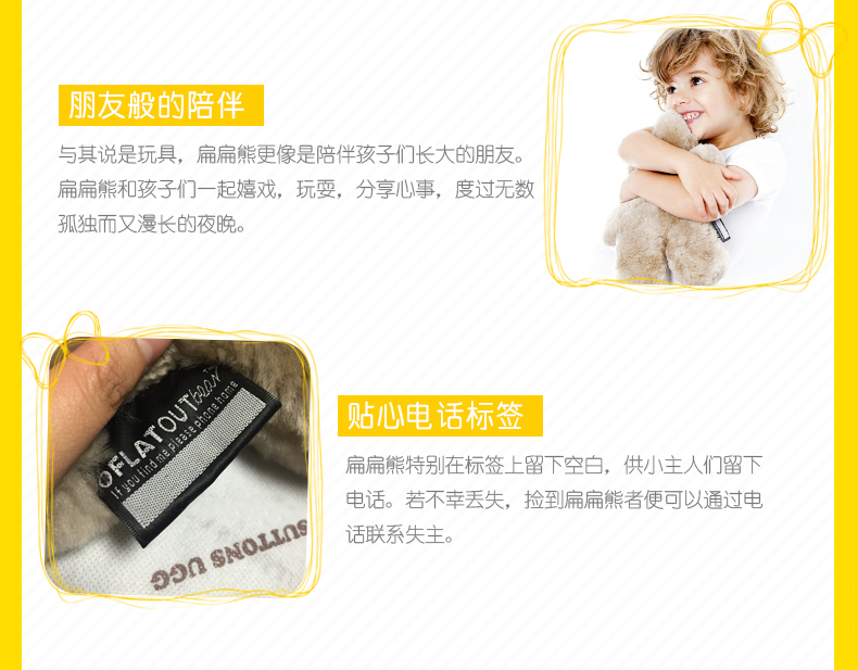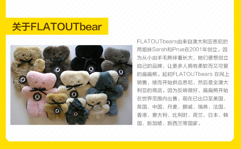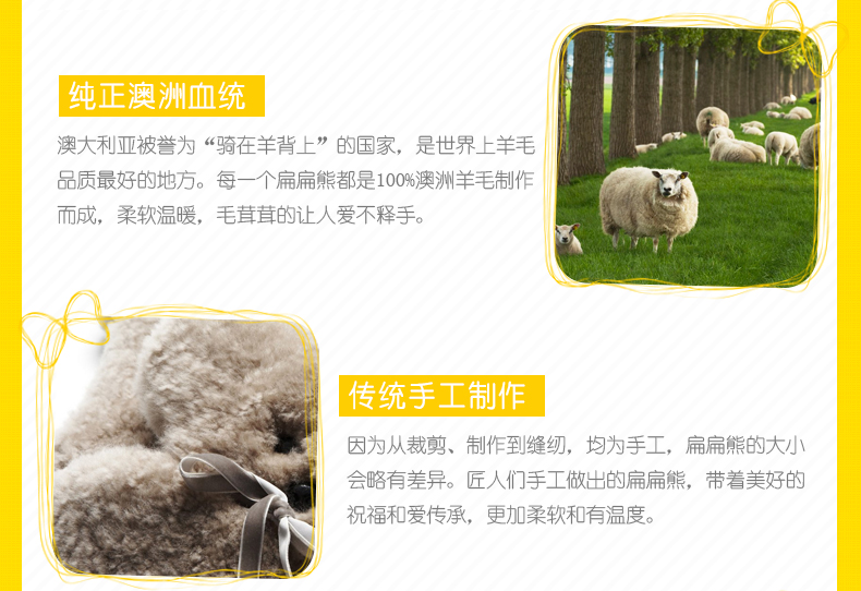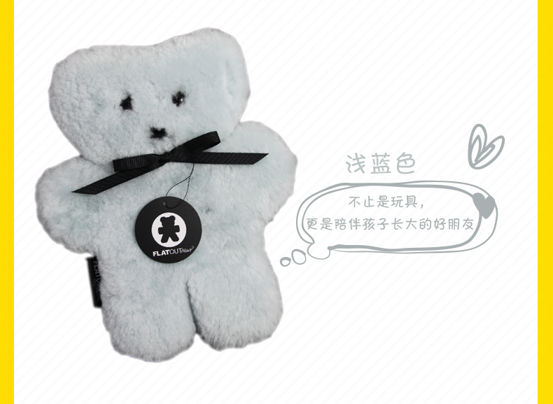 星们爱不释手的宠儿,国际上几十家权威媒体杂志都报道过它,100%澳洲纯羊毛手工制成,软软的,扁扁的让你忍不住就想抱抱它,羊毛有安神安睡的作用,对宝宝睡眠很有帮助,所以这款扁扁熊也是送个孩子的爱心礼品~