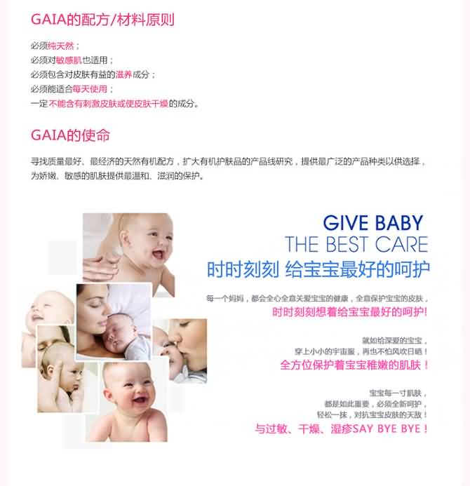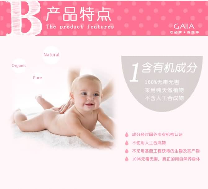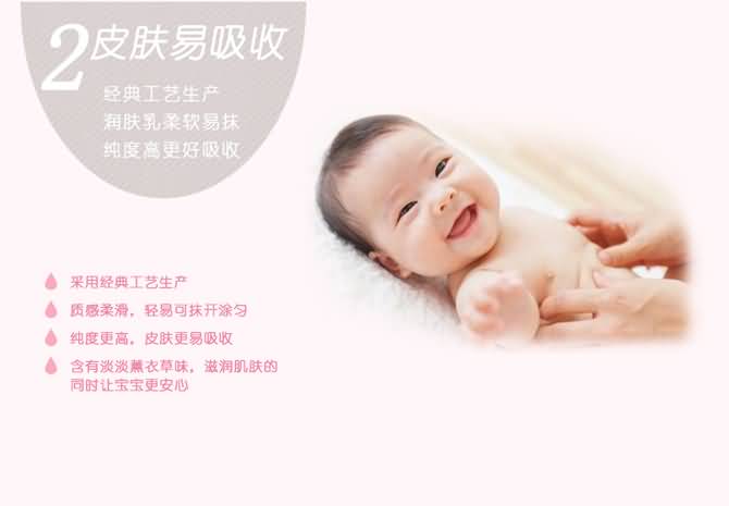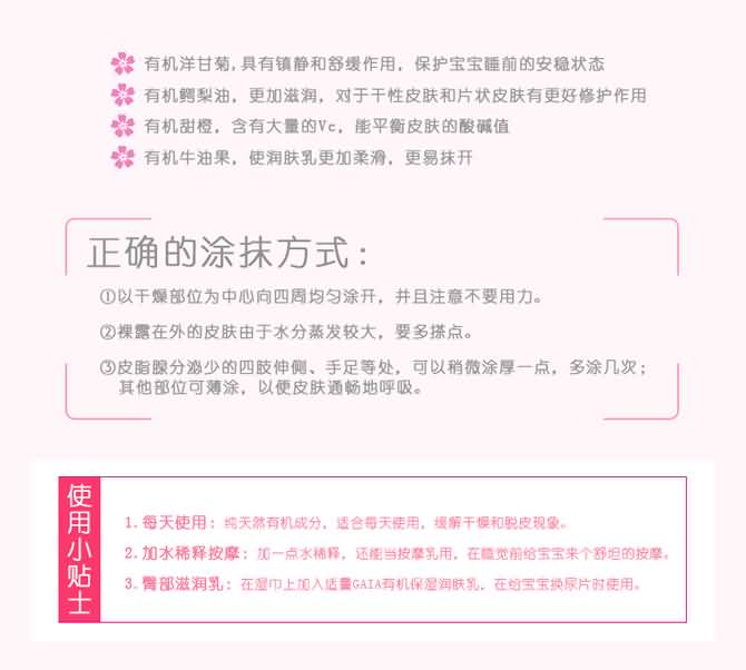 本品采用天然牛油树脂来保湿皮肤,不刺激宝宝娇嫩的皮肤。麦芽油成份,含有大量的天然维生素E,可以保持宝宝皮肤娇嫩,让宝宝皮肤远离干燥。有机甘菊精华,镇静和抚慰,睡前使用最佳。有机金盏花精华能够杀菌消炎,促进伤口愈合,舒缓镇静肌肤。