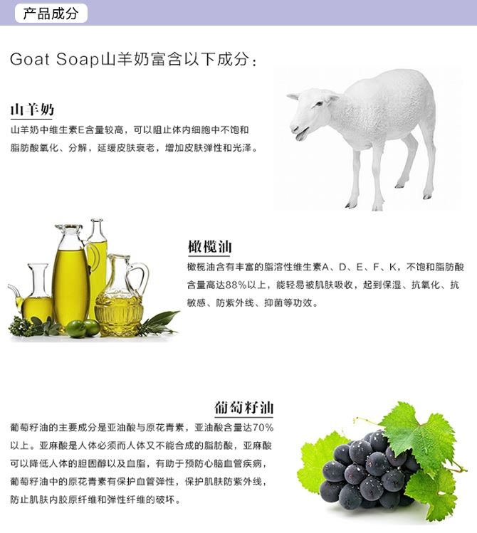 羊奶中的精华成份含有50种营养素(维他命A, C, B1, B6, B12,E),矿物质,氨基酸,柠檬酸,不饱和脂肪酸,乳酸等用来修补老化的皮肤细胞,促进细胞新生。此外,羊乳中的超氧化物歧化酸(SOD)还能延缓皮肤衰老。羊奶里含有纯天然的润肤剂,它们都是用来滋润肌肤的。羊奶中维生素E含量较高,可以阻止体内细胞中不饱和脂肪酸氧化、分解,延缓皮肤衰老,增加皮肤弹性和光泽。而且,羊奶中的上皮细胞生长因子对皮肤细胞有修复作用,是女性天然美容佳品。