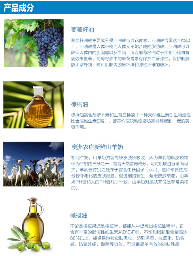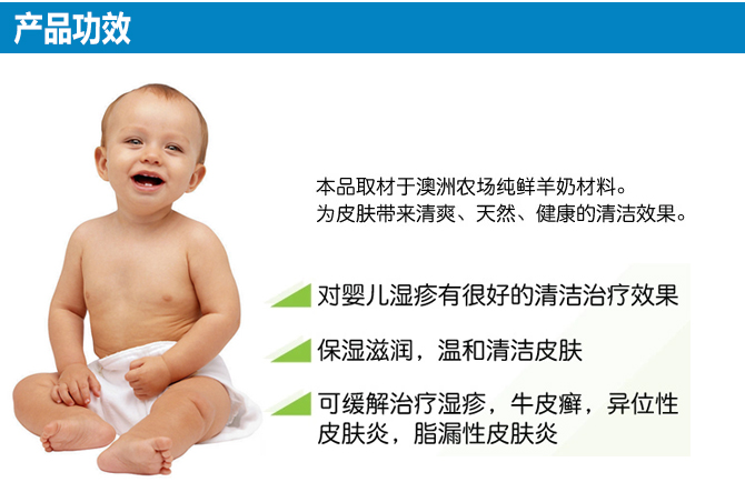 | 产品功效 | 保湿滋润,温和清洁皮肤。 同时可以缓解治疗湿疹,牛皮癣,异位性皮肤炎,脂漏性皮肤炎。 对婴儿湿疹有很好的清洁治疗效果。添加的柠檬桃金娘成分让你的肌肤留有柠檬的清香,与羊奶中含有的氨基酸结合有效去除死皮使其剥落。 |