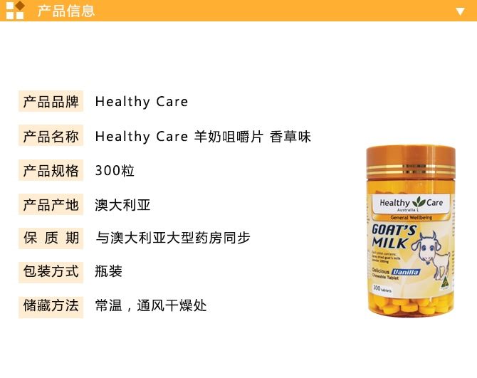 | 英文名称 | Healthy Care Goat Milk Vanilla Flavour Chewable 300 Tablets |