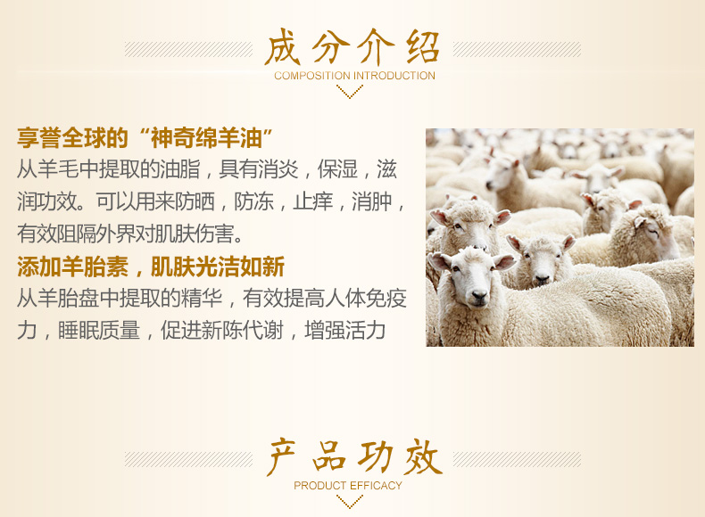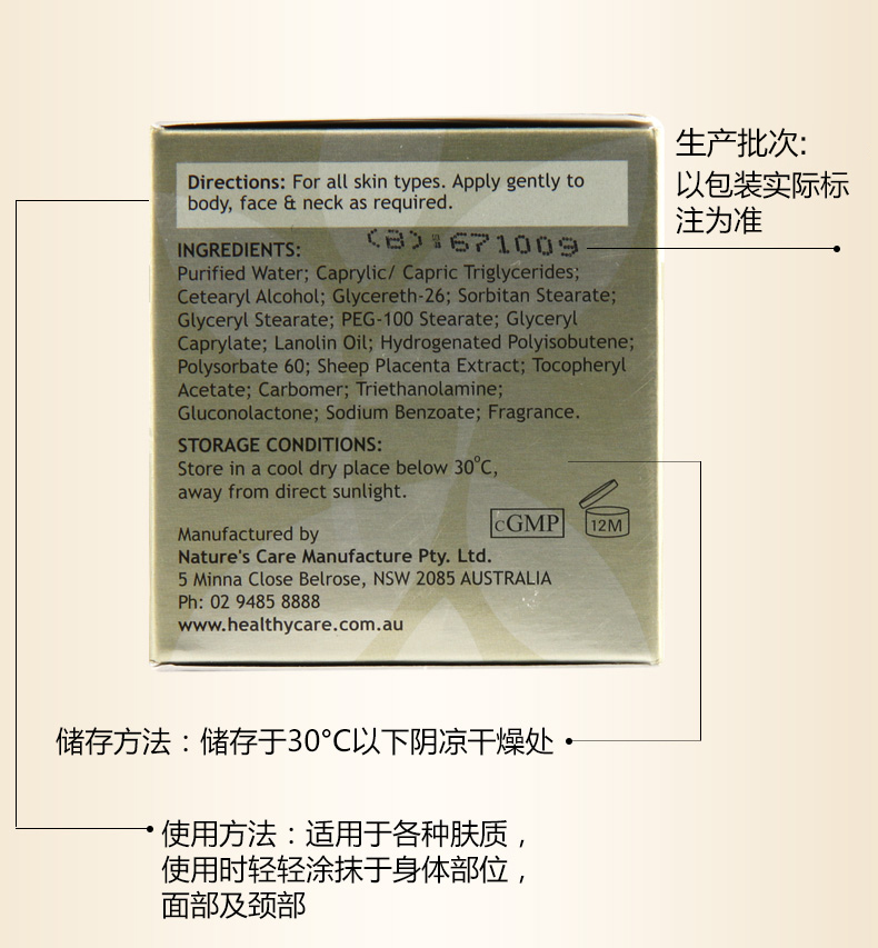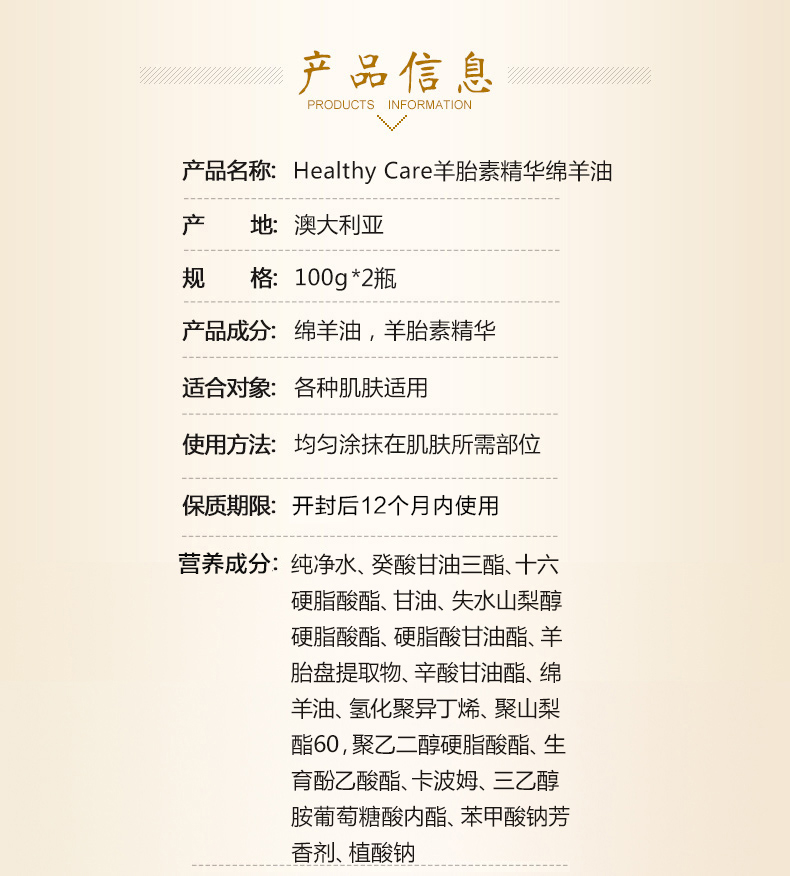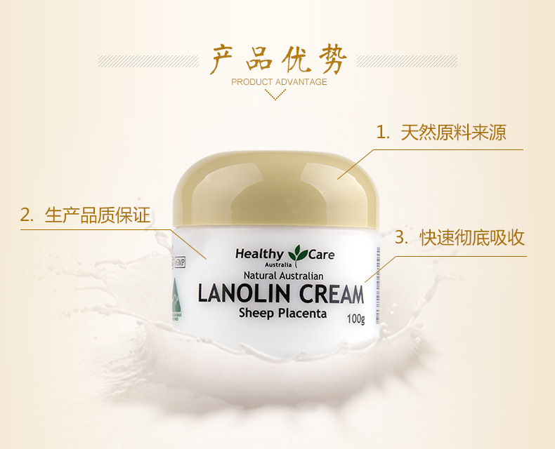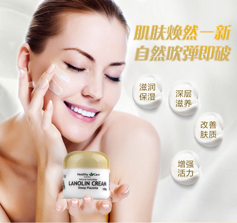 Healthy Care 羊胎素绵羊油保湿霜(深层美白)含有羊胎盘素,维他命E和羊毛脂成分。羊胎素能促进肌肤细胞新陈代谢,增加肌肤弹性;维他命E是肌肤抗氧化剂,可滋养干燥肌肤,恢复皮肤亮泽及弹性;羊毛脂滋润表面的皮肤,帮助防止水份蒸发,创建一个屏障保持皮肤的湿润度。能24小时缓释修正肌肤,具有保湿、防皱美白、滋养效果,防止皮肤老化干燥。让皮肤散发健康光泽。