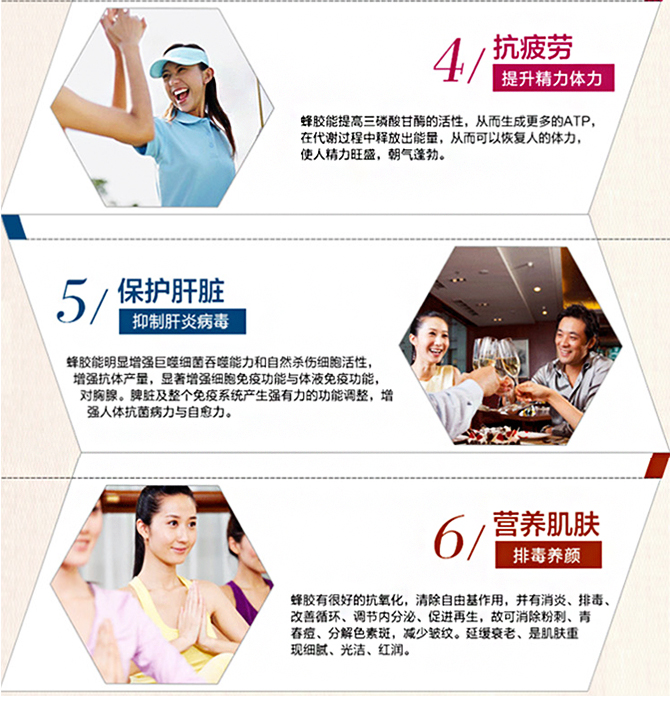 | 功效 | 蜂胶是一种“天然抗生素”又能增强天然免疫力,故对患慢性炎症、免疫力低下者常用有益,特别是慢性咽、扁桃腺炎、声带炎者、口腔炎、经常感冒、气管炎、鼻炎、眼耳炎、结肠炎、痔疮、前列腺炎、妇科炎、胆囊炎、胃炎、溃疡病、皮肤病等。营养肌肤,延缓衰老:蜂胶有很好的抗氧化,清除自由基作用,并有消炎、排毒、改善循环、调节内分泌、促进再生、故可消除粉刺、青春痘、分解色素斑、减少皱纹、延缓衰老、使肌肤重现细腻、光洁、红润。对心血管病的预防作用:能降低血脂、软化血管、改善循环、适合于高血压,高血脂、动脉硬化、冠心病等。 |