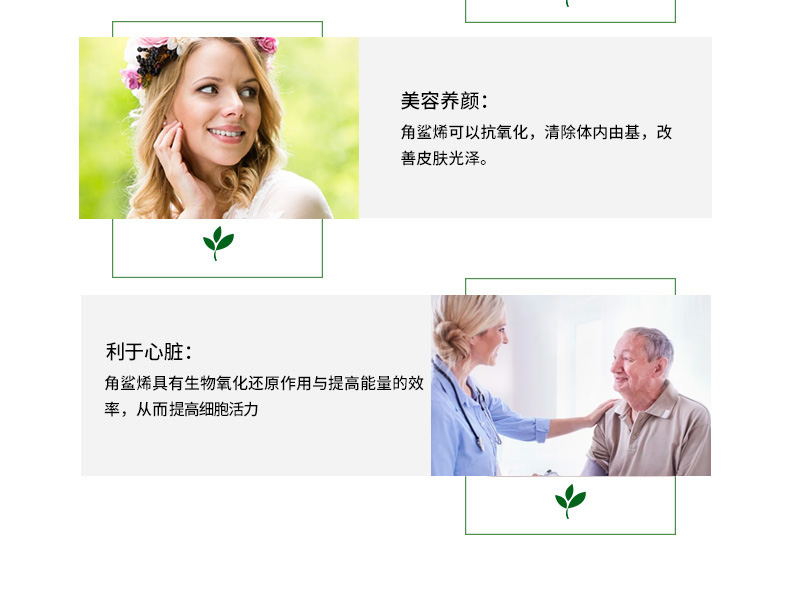 本产品采用高科技提炼港式,能稳定化处理并保存角鲨烯的营养价值,迅速将氧气输送到缺氧细胞,使其恢复活力,改善体质,发挥角鲨烯的最大功效。可以增加组织供氧,消除疲劳,促进新陈代谢,增加脑部机能,增强记忆力,改善睡眠,降低血脂,促进血液循环,改善心血管疾病,延缓衰老。增强人体免疫力,保护肝脏。