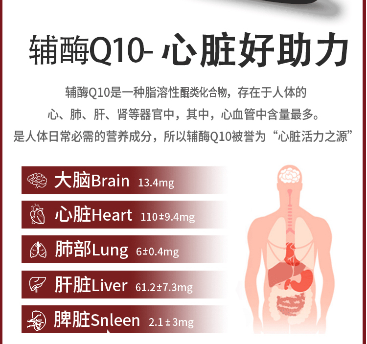 泛醇-10(KanekaQH™泛醇) 150mg。成人 – 每日 1-2 粒胶囊,随餐服用,或按照健康专业人士的指示服用。还原性辅酶