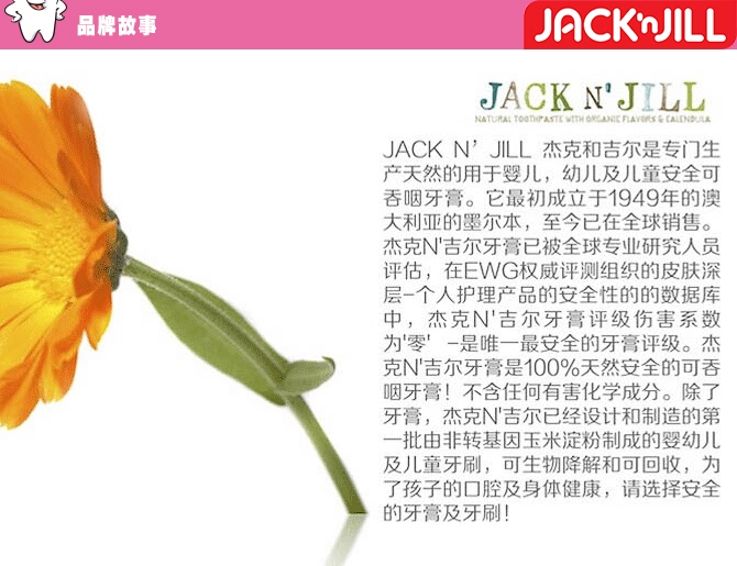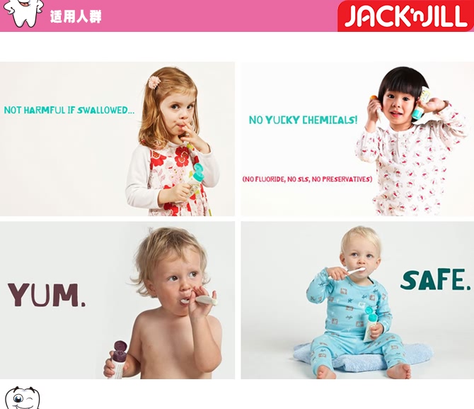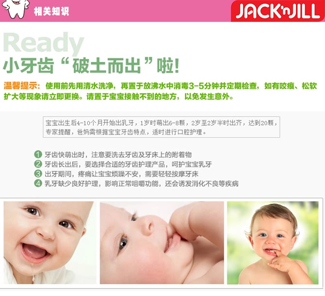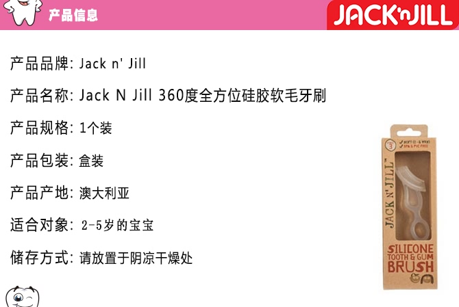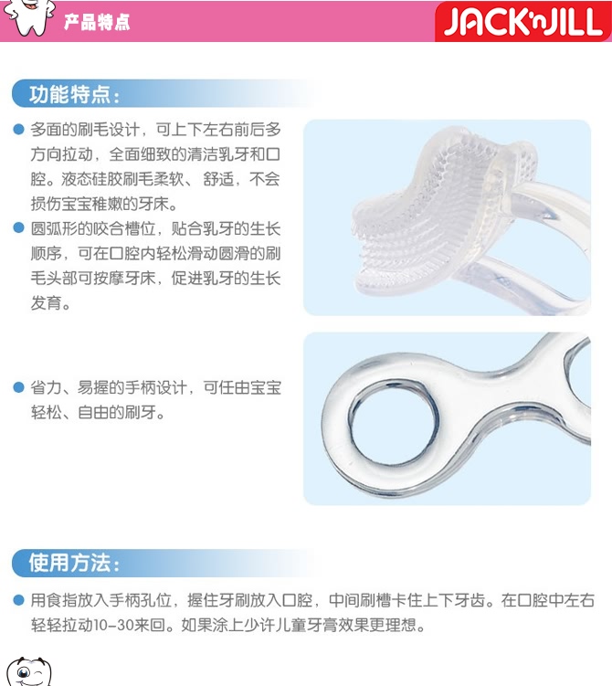 Jack N' Jill 专为2-5岁宝宝阶段设计,可以有效清洁牙床和牙齿。此款小牙刷有两面,能同时上下或前后的清洁牙齿,宝宝自己用或妈妈给宝宝用都很方便。