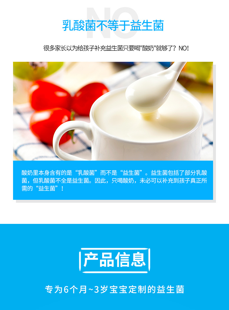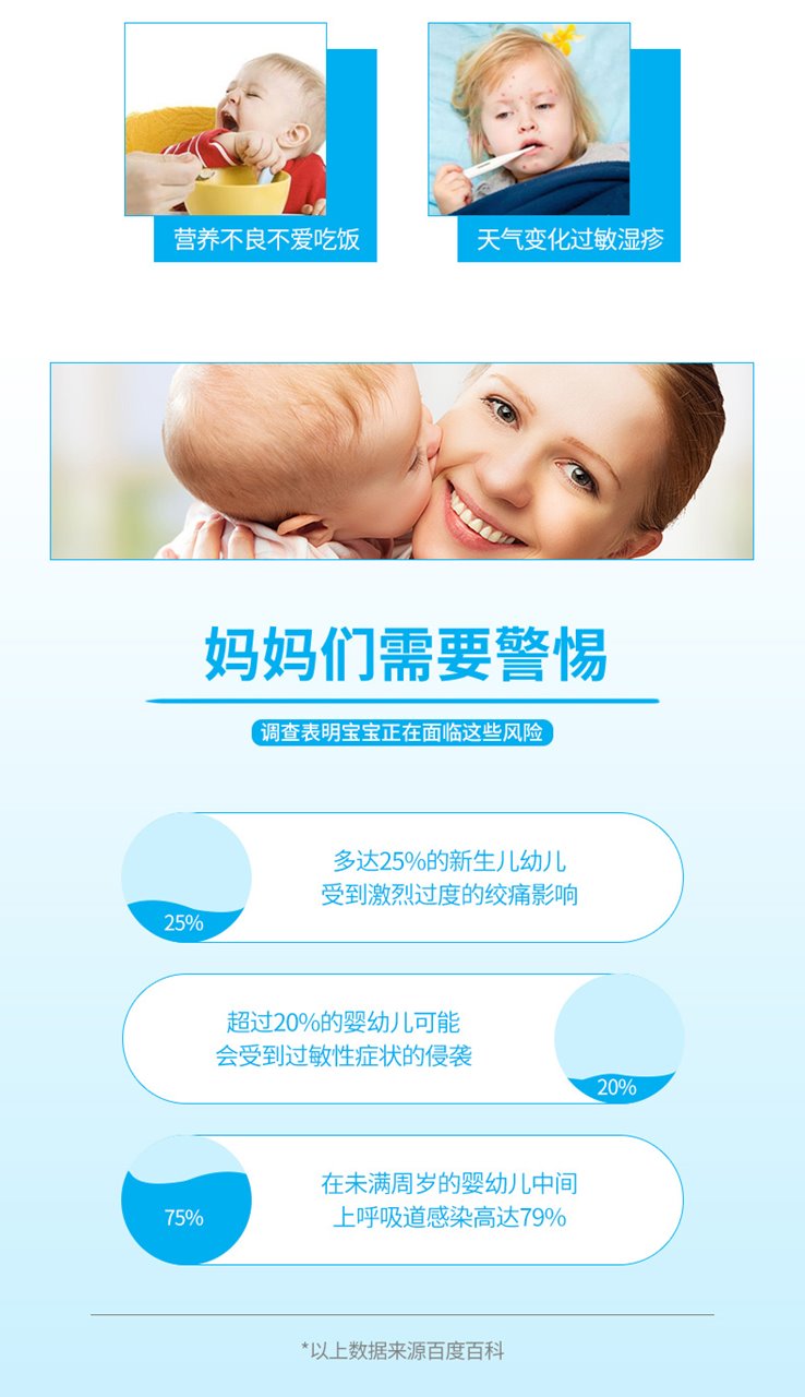 本产品可以提高婴幼儿免疫力。益生菌通过改善营养吸收,抑制有害微生物,去除肠道里产生毒性大肠杆菌的肠毒素,刺激免疫球蛋白IGA,刺激淋巴细胞等方式,提高婴幼儿免疫力。患有湿疹、过敏性体质的婴幼儿通过调节婴幼儿免疫,从根本上改善湿疹,安全、有效,是最适合湿疹儿童的益生菌。有效适用容易腹泻、拉肚子、便秘的婴儿、儿童,防止肠道受感染。具有促进益生菌数量的生长,增加被抗生素杀死的有益细菌数量,提高免疫力。