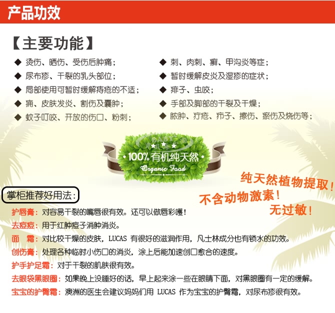 | 产品功效 | 烫伤、晒伤、受伤后肿痛;皮肤发炎、割伤及囊肿;蚊子叮咬、开放的伤口粉刺;暂时缓解皮炎及湿疹的症状;手部及脚步的干裂及干燥;润唇、面部滋润。 |