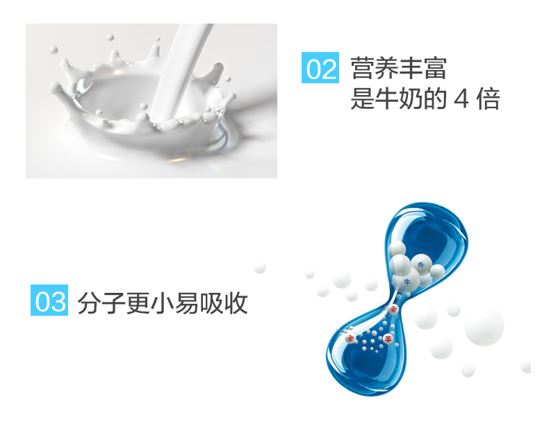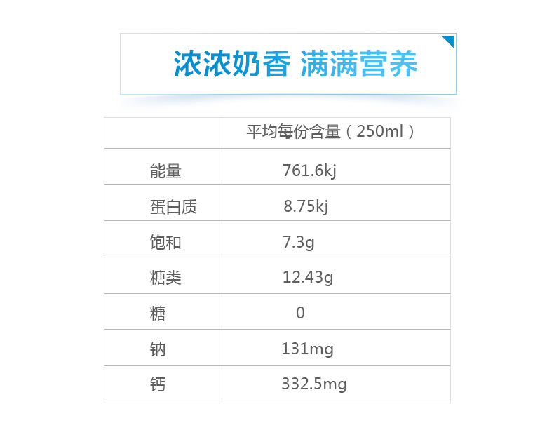本产品含有独特的EGF生长因子,增强肌肤自我修护能力。促进胶原蛋白的合成,是肌肤光嫩有弹性。可脂肪颗粒体积仅为牛奶的1/3,让你享受全脂的口味和营养,还不用担心喝奶会胖。富含维生素A和维生素D,钙质是普通牛奶的两倍。蛋白质、矿物质以及各种维生素的总含量均大于牛奶。