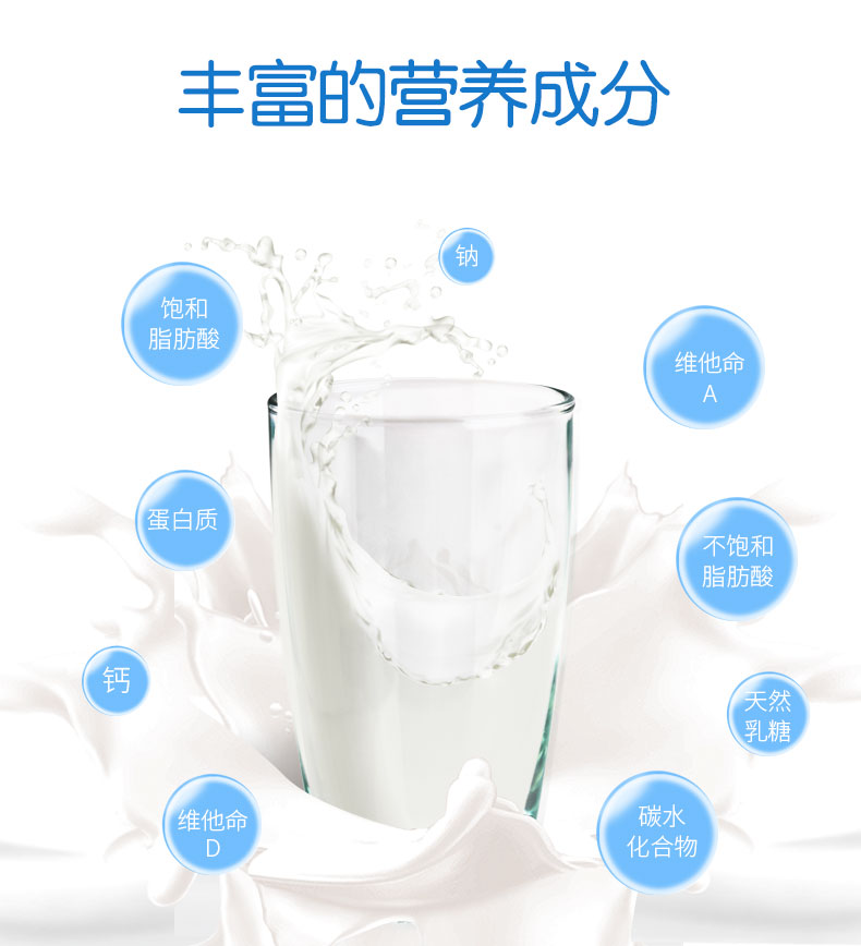 本产品可以有效补充钙质。每250ml牛奶中含有315mg的钙,比一般牛奶高35%。青少年长个,中老年人防止钙流失,老年人预防骨质疏松。增强机体免疫力,含有高蛋白和维生素D,支持免疫系统,配合钙质吸收。含有超维A可以抗氧化,滋润肌肤。