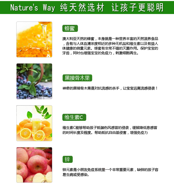 【运输途中高温天气,产品有融化风险,无法售后。建议走EWE,如遇融化,签收72小时内提供破损物品与外包装合照(需清晰识别面单),可向EWE申请售后理赔,我司不参与理赔】Nature's Way是世界上最具创新精神的健康产品品牌之一,特别是他们开发的Kids Smart系列产品,以卓越的口味,有趣的外形,纯净的品质,受到几十个国家儿童的欢迎,畅销全球!旗下所有产品都经过严格的检测,符合澳大利亚TGA(Therapeutics Goods Administration)标准。TGA类似于美国的FDA,TGA的标准是世界上最严格的食品药品标准之一。其产品保证不含色素、防腐剂、麸质、乳糖及其他不期望存在的成份!