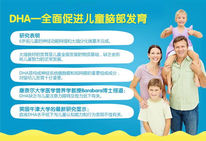 | 功效 | 为小朋友补充所需营养,从而促进脑部运作发展,对于记忆力、思考力及创作力均有显著效果,加上DHA是情绪管理系统细胞的重要成份,有助提升小朋友的自我控制力,学习自然更有效率并加强他们的IQ及EQ,成绩自然更超卓。 |