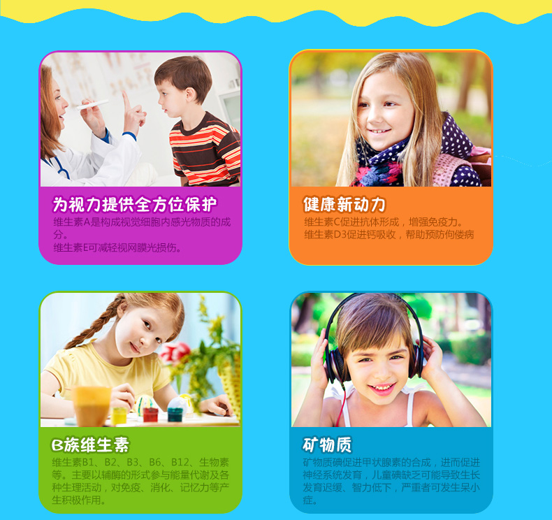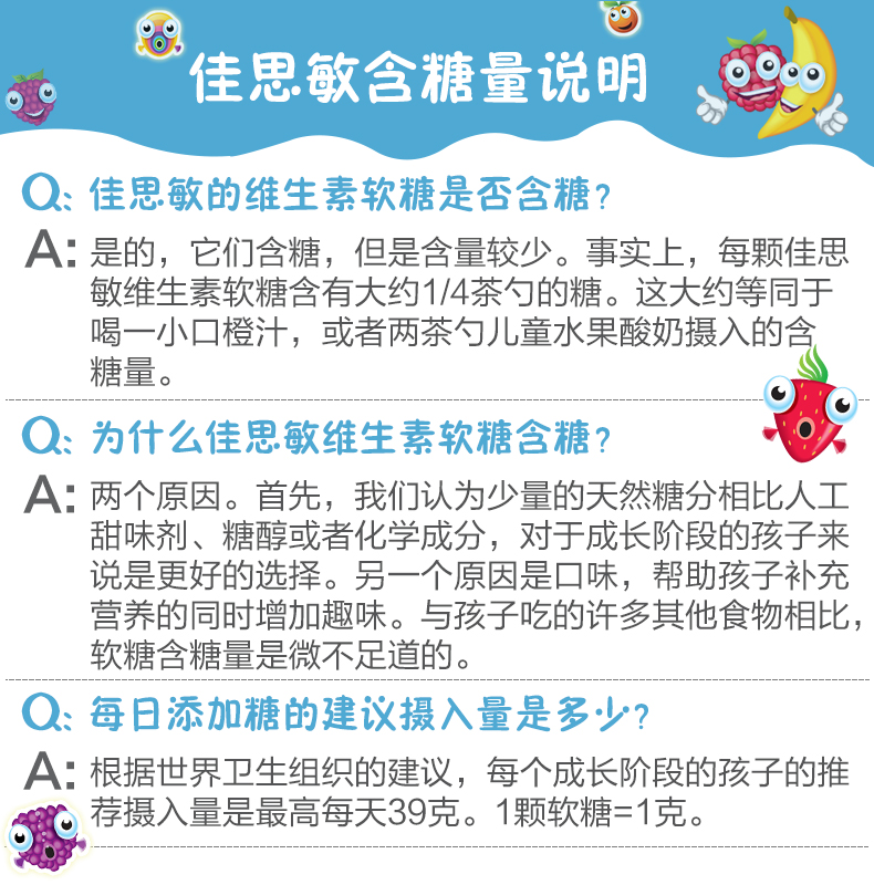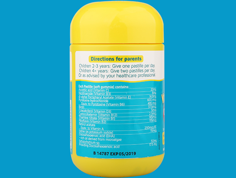 | 特别说明 | 1、2到3岁小孩:一天一粒 2、4岁以上小孩:一天两粒或遵医嘱 3、请储藏在25度以下的环境。 4、无任何人工添加色素或口味。不含乳制品,蛋,豆类,花生和酵素。 |