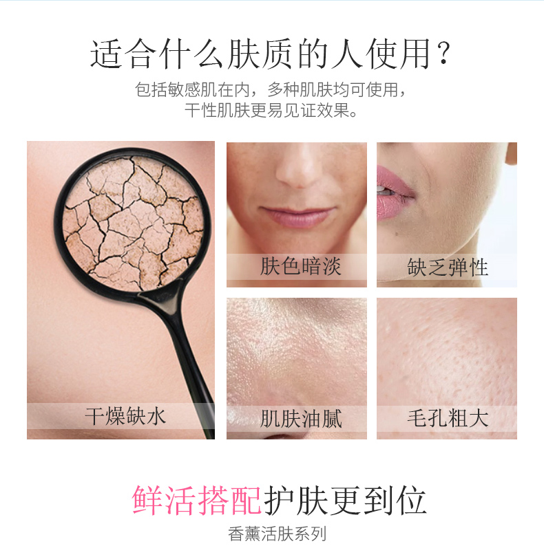 本产品具有卓越的调理作用,渗入肌肤,预防黑色素沉着,改善肌肤晦暗状态,恢复肌肤白皙光彩。保湿补水,增加肌肤含水量。洋甘菊温和的特性舒缓镇静肌肤,放松肌肤紧张状态,唤醒肌肤自我维护能力。洋甘菊成分还对换季和晒后敏感肌肤都起到修复作用。
