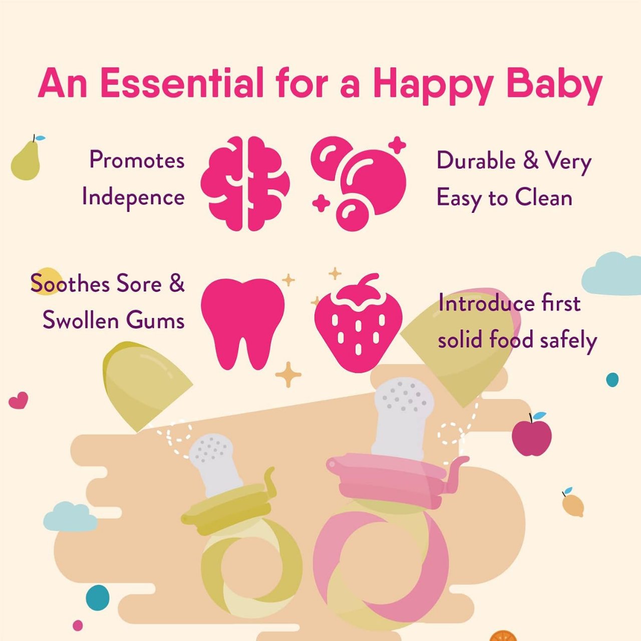 NatureBond 婴儿水果喂食器和牙胶采用糖果般的颜色设计,可刺激宝宝对水果和蔬菜中天然营养物质的摄取。这也是在宝宝断奶和出牙阶段向他们介绍固体食物的一种安全方法。一体式喂食器还可以通过咀嚼按摩牙龈来缓解宝宝出牙时的不适。