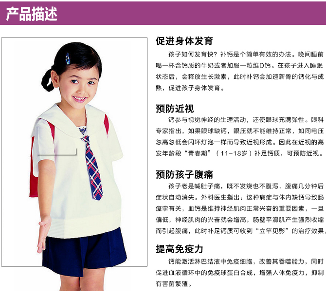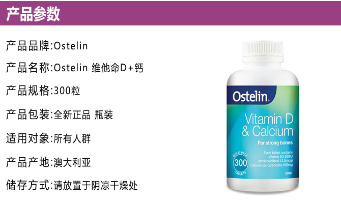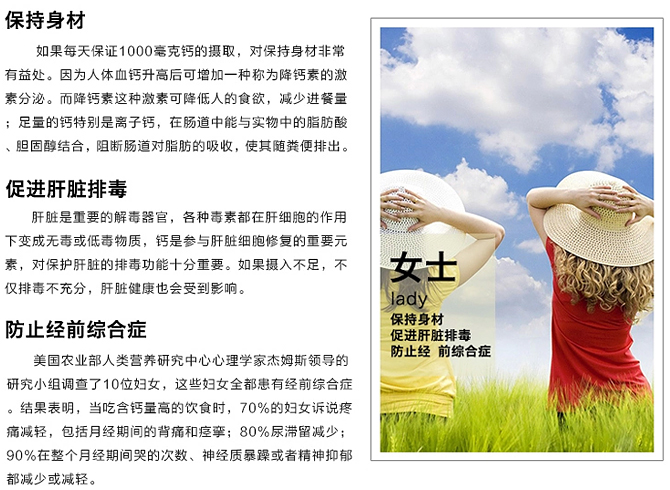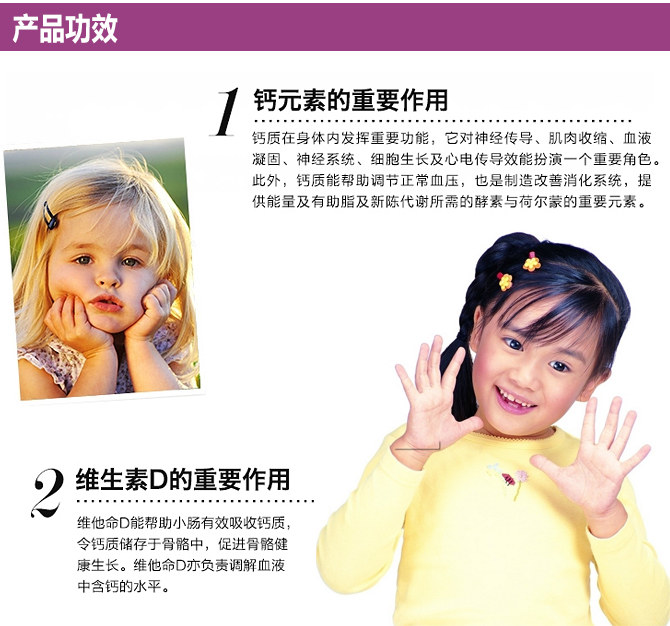 本产品钙片包含了维生素D,更能加快人体对钙的吸收。在钙中添加维生素D,可以促进钙质在肠胃中的吸收,同时预防钙质的流失。补充钙质同时补充维生素D,可以预防骨质疏松,强健骨骼牙齿,保护人体健康。