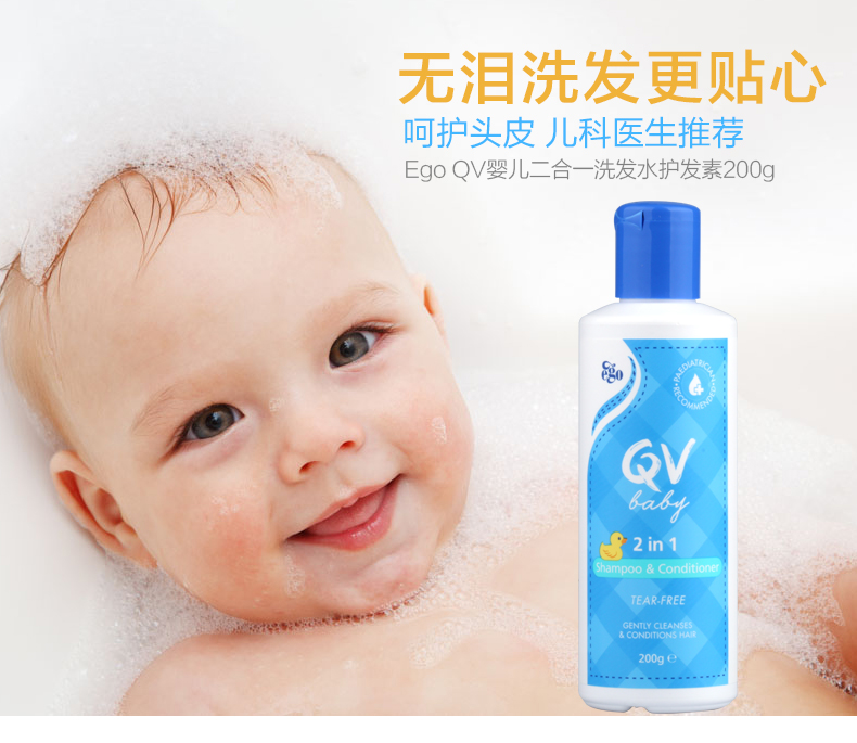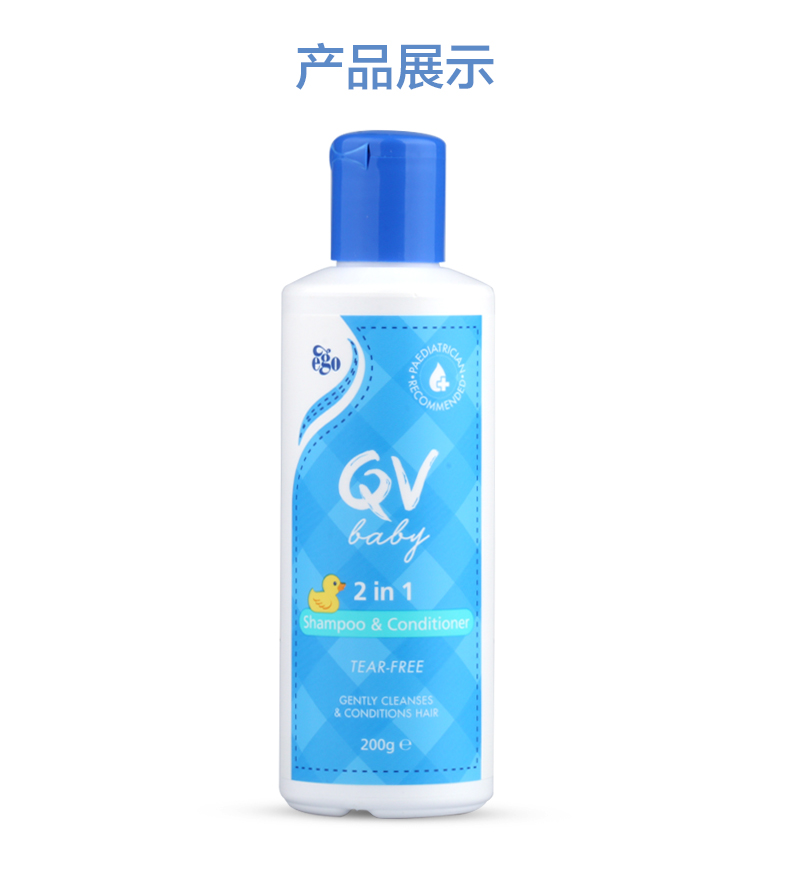 QV系列 宝宝洗护2合1洗发水采用专业无泪营养配方,特别为婴儿幼嫩肌肤设计。蕴含多种天然植物萃取精华活性成分,温和安全可靠,质地柔滑细腻,在轻柔的清洁头部的同时帮助维持天然水油平衡,有效清洁宝宝头发中多余的不洁物,增进皮肤和头皮的光泽与弹性。可用于婴幼儿洗发、洗手,绝不伤害宝宝娇嫩的肌肤。使宝宝享受清洁、柔嫩、香甜、舒适。