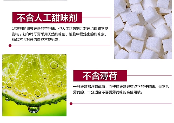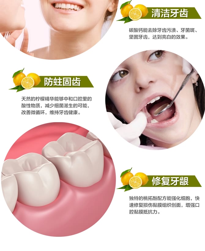 本产品含有天然柠檬香,是人工香剂无法代替的天然清新,市面上柠檬味的产品大多添加人工香剂,而这款牙膏的柠檬香是直接由天然柠檬提取的精油调制,天然感受。柠檬本身就是去除异味的好帮手,柠檬牙膏不但能有效去除口气,还能给你留下清新的柠檬香味。含有的碳酸钙能有效去除牙齿污渍、牙菌斑,坚固牙齿,达到亮白的效果。天然的柠檬精华能中和口腔里的酸性物质,减少细菌滋生的可能,改善微循环,维持牙齿健康。桃拓酚配方能强化细胞,快速修复损伤粘膜组织创面,增强口腔黏膜抵抗力。