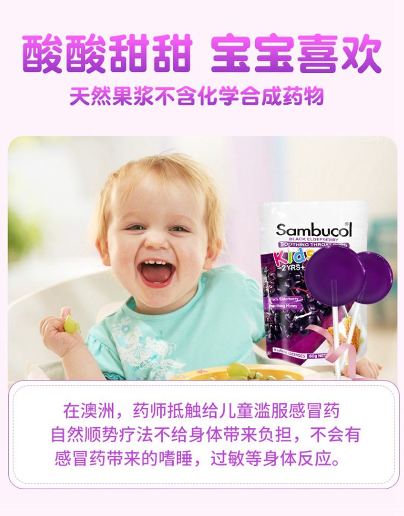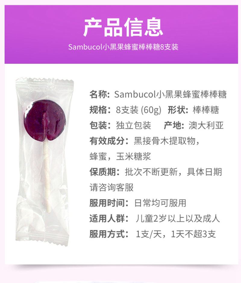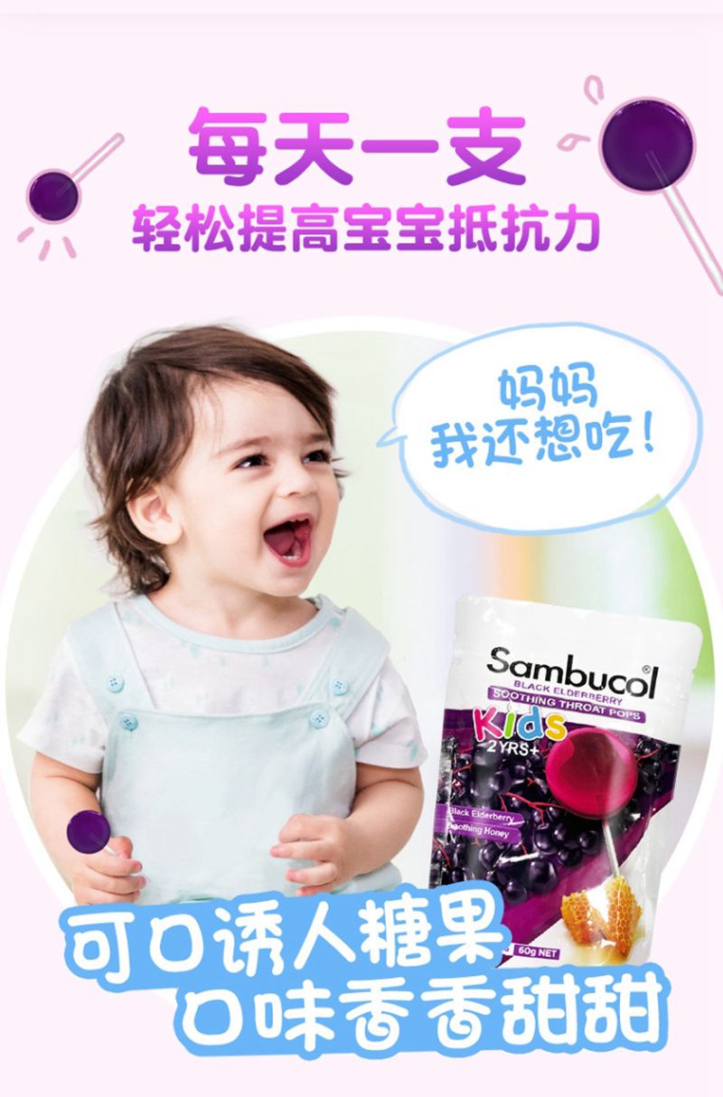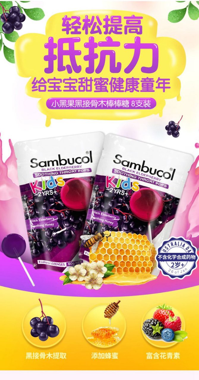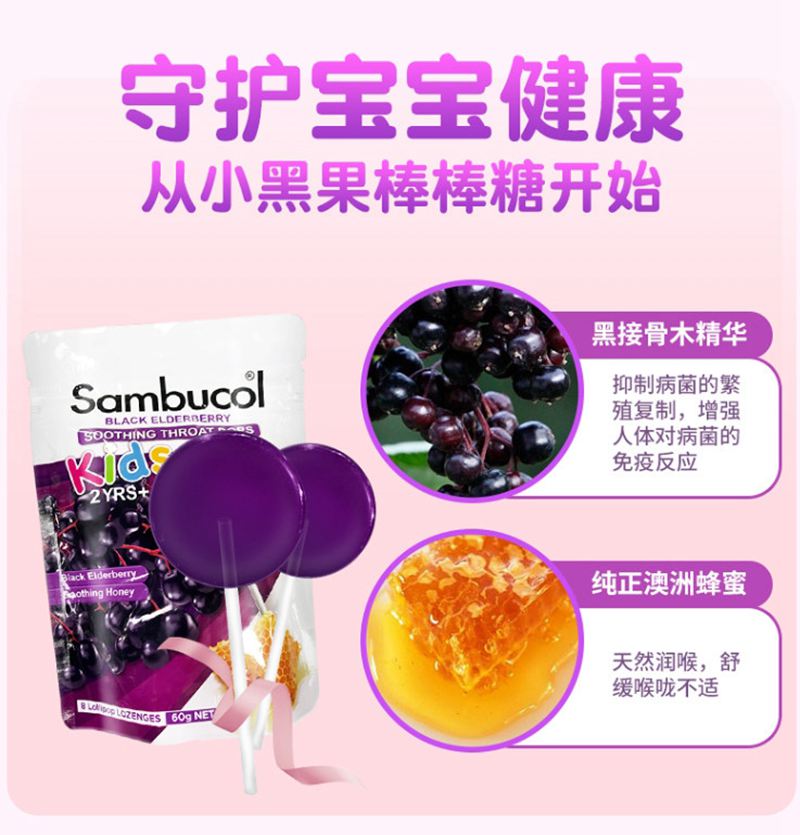 特价 Sambucol 黑接骨木儿童止咳润喉棒棒糖 8支装