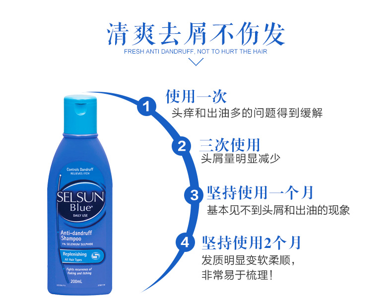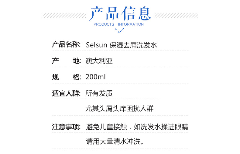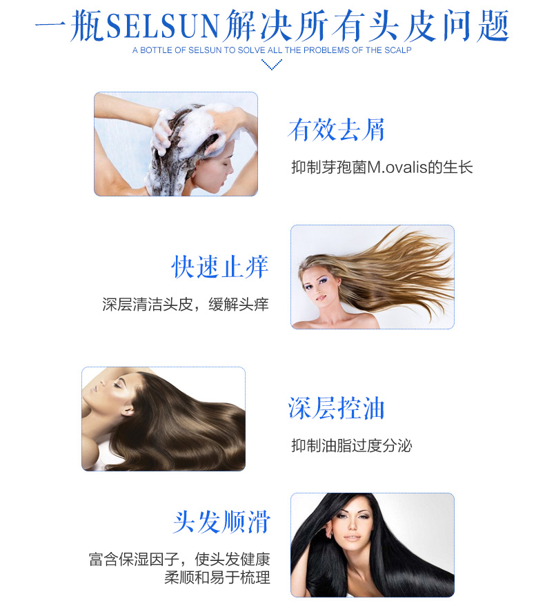 Selsun 去屑保湿洗发露洁净同时强化头皮的天然益菌保护膜,能有效去屑但不伤害皮脂膜,从根源上解决多屑问题,完美解决头屑问题。能够温和清洁于修复头部皮肤,平衡发丝的PH值,多层次的抑制头皮屑的生成,提升肌肤自身修护能力于抵抗力;迅速有效、持久去除头屑的困扰,防止头屑再生;保护发根、修复头皮;去除头痒烦恼,镇静修复,令心情更舒畅,让秀发清爽怡人。
