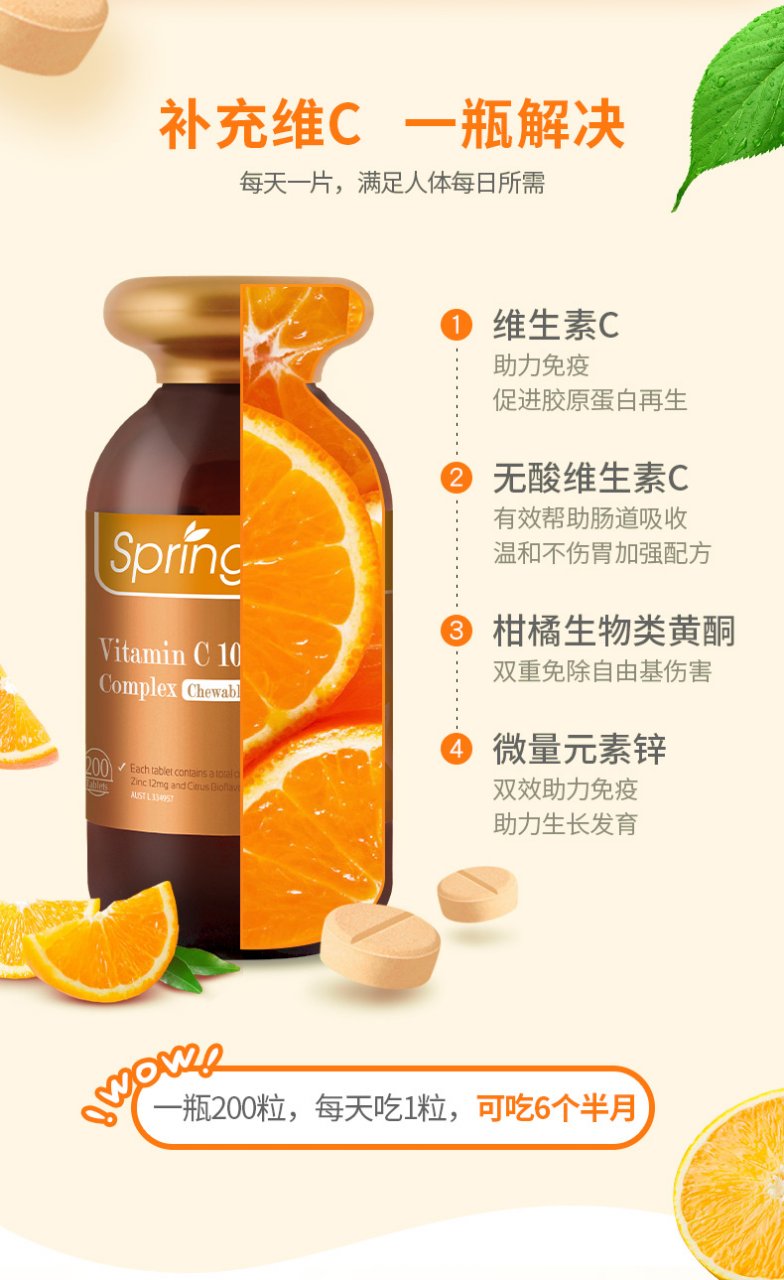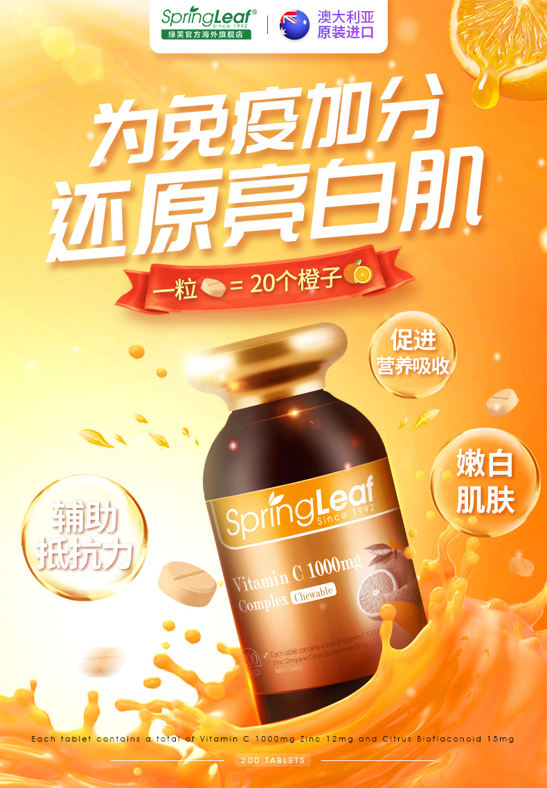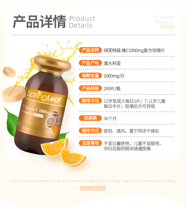 特价清仓🉐SpringLeaf 绿芙 高浓度维生素C咀嚼片 1000mg 200粒 2025-08