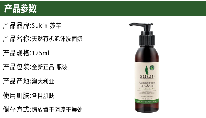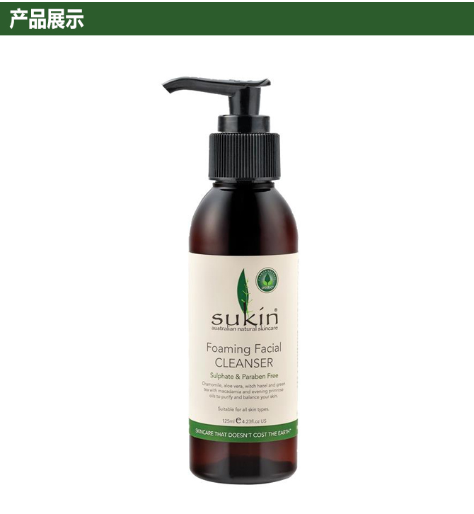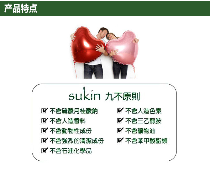 来自澳洲的SUKIN 是100% 天然有机产品,致力于为顾客提供高素质且价格相宜的护肤品,采用100% 活性物质,所有产品均由澳洲天然草本植物提取,不含下列化学物质:不含硫酸月桂酸钠、不含人造香料、不含动物性成分、不含强烈的清洁成分、不含石油化学品、不含人造色素、不含三乙醇胺、不含矿物油、不含苯甲酸酯类。