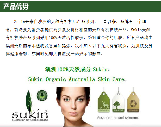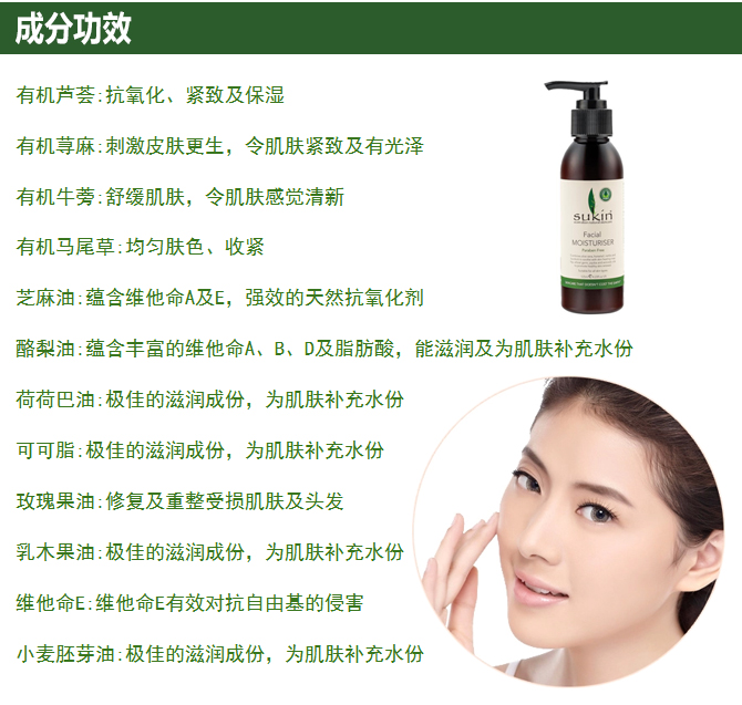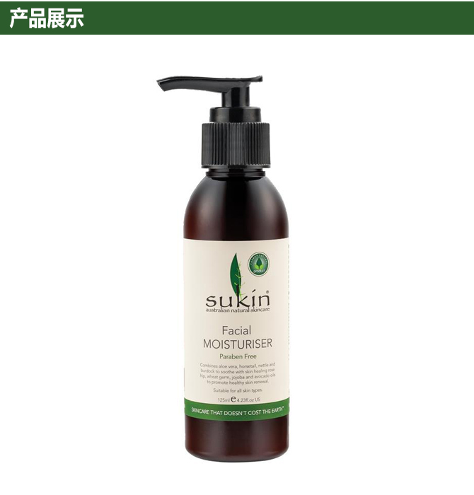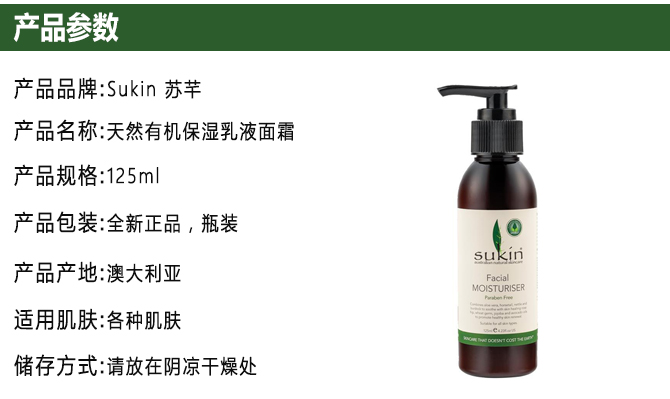 Sukin 纯天然面部护理保湿霜,质感轻盈的乳霜,能被肌肤容易吸收,可以为肌肤补充足够的水份,滋养及修护肌肤;蕴含荷荷巴油、酪梨油、小麦胚芽油、玫瑰果油及维他命E,能舒缓肌肤,令肌肤感觉柔软舒适,更具备抗氧化功效,有助修复肌肤;配方不含人造成份,包括人造香料及苯甲酸酯类。