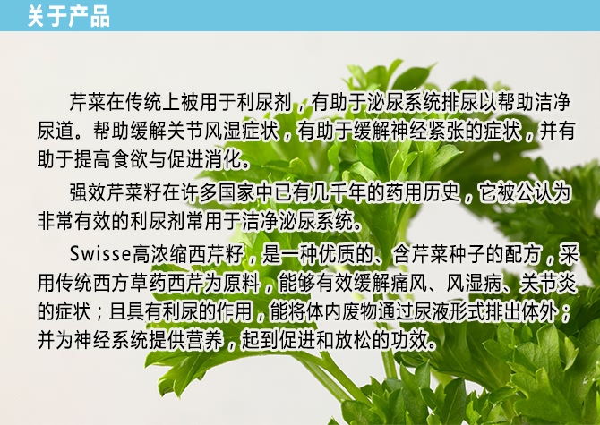 | 功效 | 高浓缩西芹籽,采用传统西方草药西芹为原料,能够有效缓解痛风、风湿病、关节炎的症状;且具有利尿的作用,能将体内废物通过尿液形式排出体外;并为神经系统提供营养,起到促进和放松的功效 |