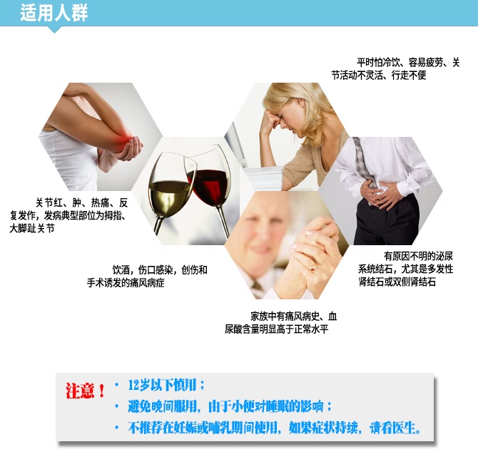 | 适用人群 | 关节红、肿、热痛、反复发作,发病典型部位为拇指、大脚趾关节(包括膝、腕、肘和掌指关节等部位);饮酒,伤口感染,创伤和手术诱发的痛风病症;平时怕冷饮、容易疲劳、关节活动不灵活、行走不便;家族中有痛风病史、血尿酸含量明显高于正常水平;有原因不明的泌尿系统结石,尤其是多发性肾结石或双侧肾结石 |