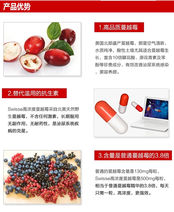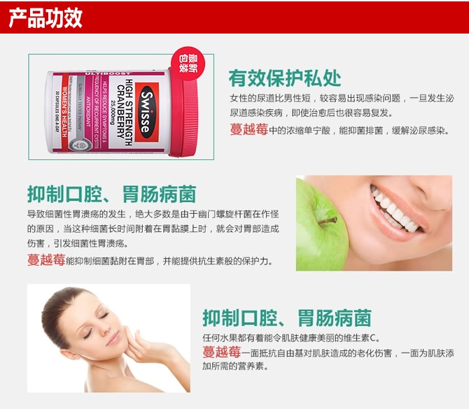 | 功效 | 渊源不断的补充蔓越莓所含的多种营养元素,美容又促进女性自洁功能,时刻消除妇科病隐患,每天一粒,年轻健康又美丽。 |