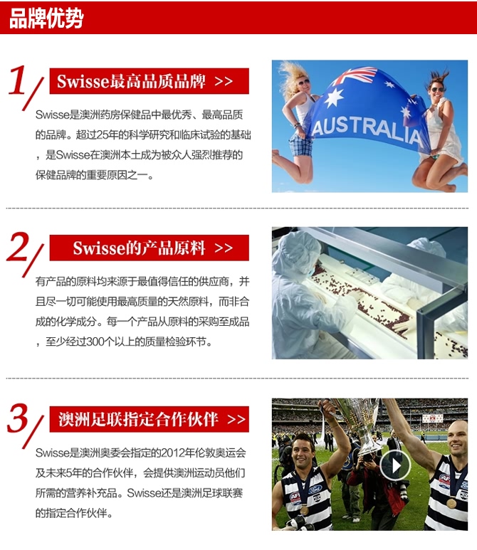 “以科学实现健康,以成效主导市场”Swisse公司始创于本世纪50年代末成立于澳大利亚墨尔本,澳洲自然医学疗法的先驱之一。所有产品原料均来源于 最值得信任的供应商,并且尽一切可能使用最高质量的天然原料,而非合成的化学成分。每一个产品从原料的采购至成品,至少经过300个以上的质量检验环节。 Swisse在研究产品配方时唯一关注的是品质,从不考虑成本。因此,Swisse产品在澳洲本土市场上的价格也略贵于其他同类产品。