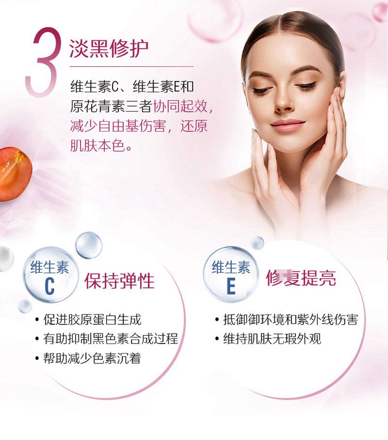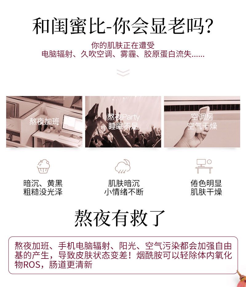 - 适宜人群:希望肌肤年轻白净、淡化脸部色素、色斑的女士;爱美的女士;经常加班熬夜,暴露在屏幕辐射下的多屏党;户外活动多,皮肤长期暴露在紫外线下的人士;久坐不动,渴望缓解下肢水肿问题的职场人士