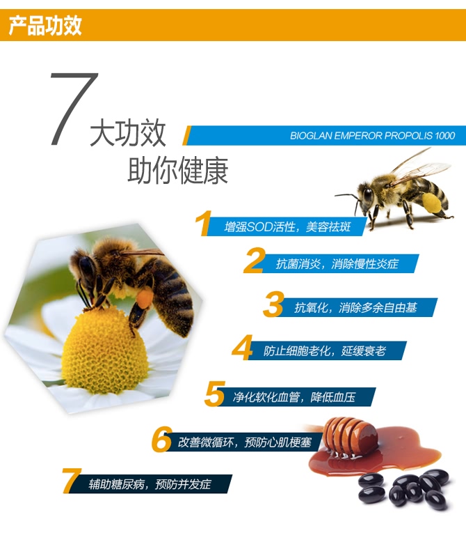 【运输途中高温天气,胶囊类产品有融化风险,建议发EWE,如遇融化可向EWE申请理赔产品款,我司不参与理赔】蜂胶是一种“天然抗生素”又能增强天然免疫力,故对患慢性炎症、免疫力低下者常用有益,对心血管病的预防作用:能降低血脂、软化血管、改善循环、适合于高血压,高血脂、动脉硬化、冠心病等。适合老年人和体质较弱的人食用。